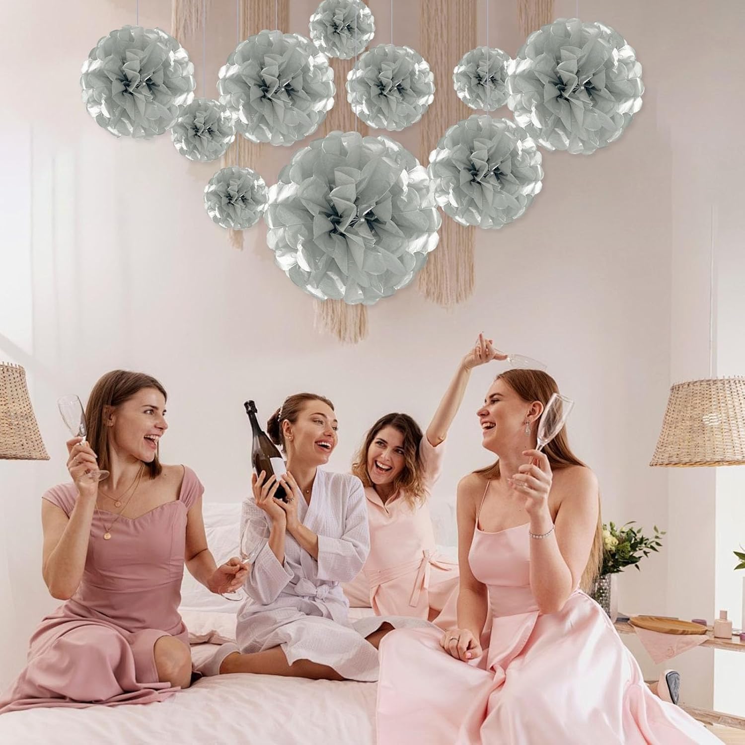- 【Large Set】20 Pieces silver paper flower balls include 6 of 6-inch, 6 of 10-inch, 5 of 12-inch, and 3 of extra-large 14 inch paper pom pom flowers.