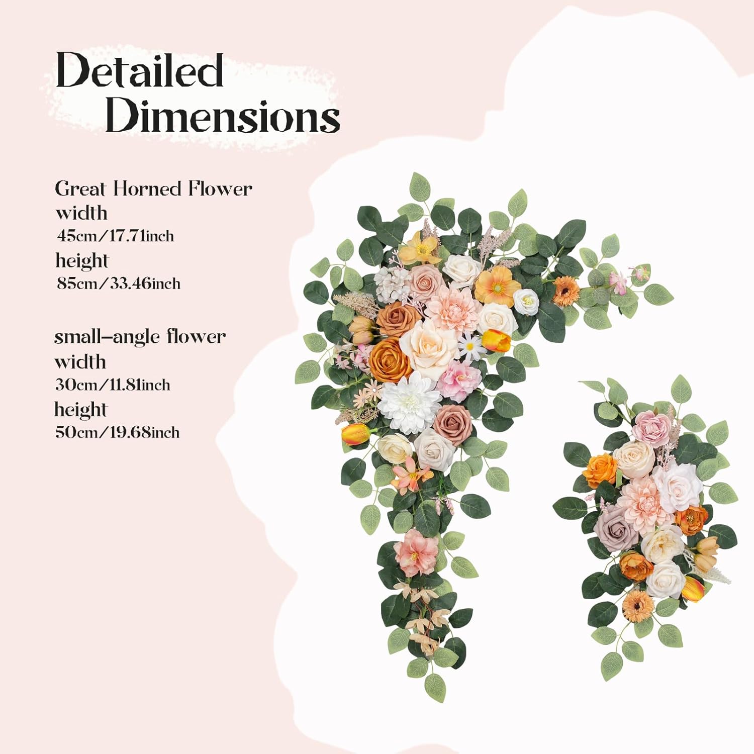 - 🌷 Size and Package:Our wedding arch flowers has a large corner size of 33.46 "L x 17.7" W and a small corner size of 19.68 "L x 11.8" W. The wedding decor packaging contains a total of 3 kinds of accessories,including Wedding Flowers Ornament x2 + Cable Tie x 6 +20pcs plastic stems (Does not include wooden sign and bracket).