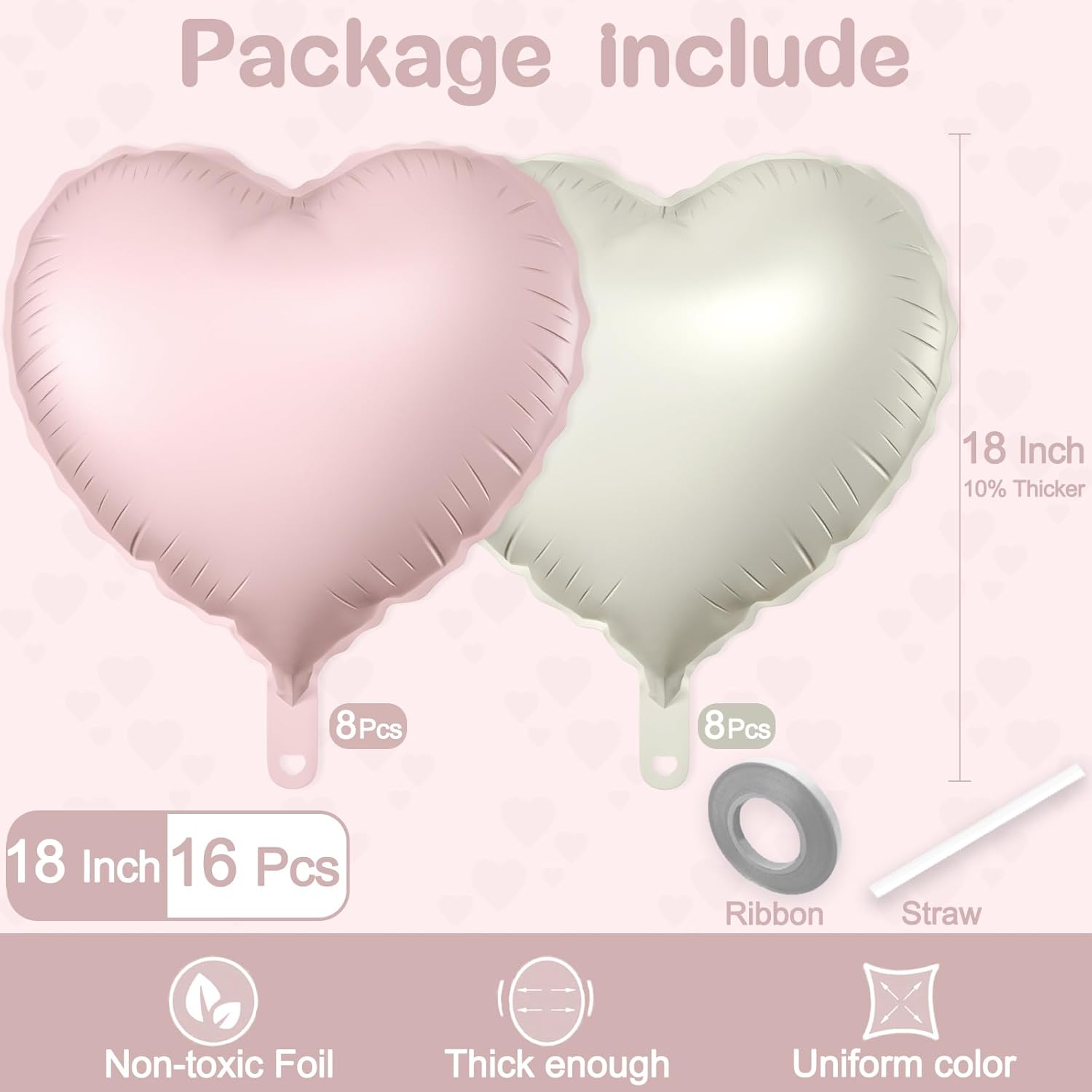 - Package Include: 18 inch heart shaped balloons (8 Pcs Pink, 8 Pcs White Sand) + straw and ribbon