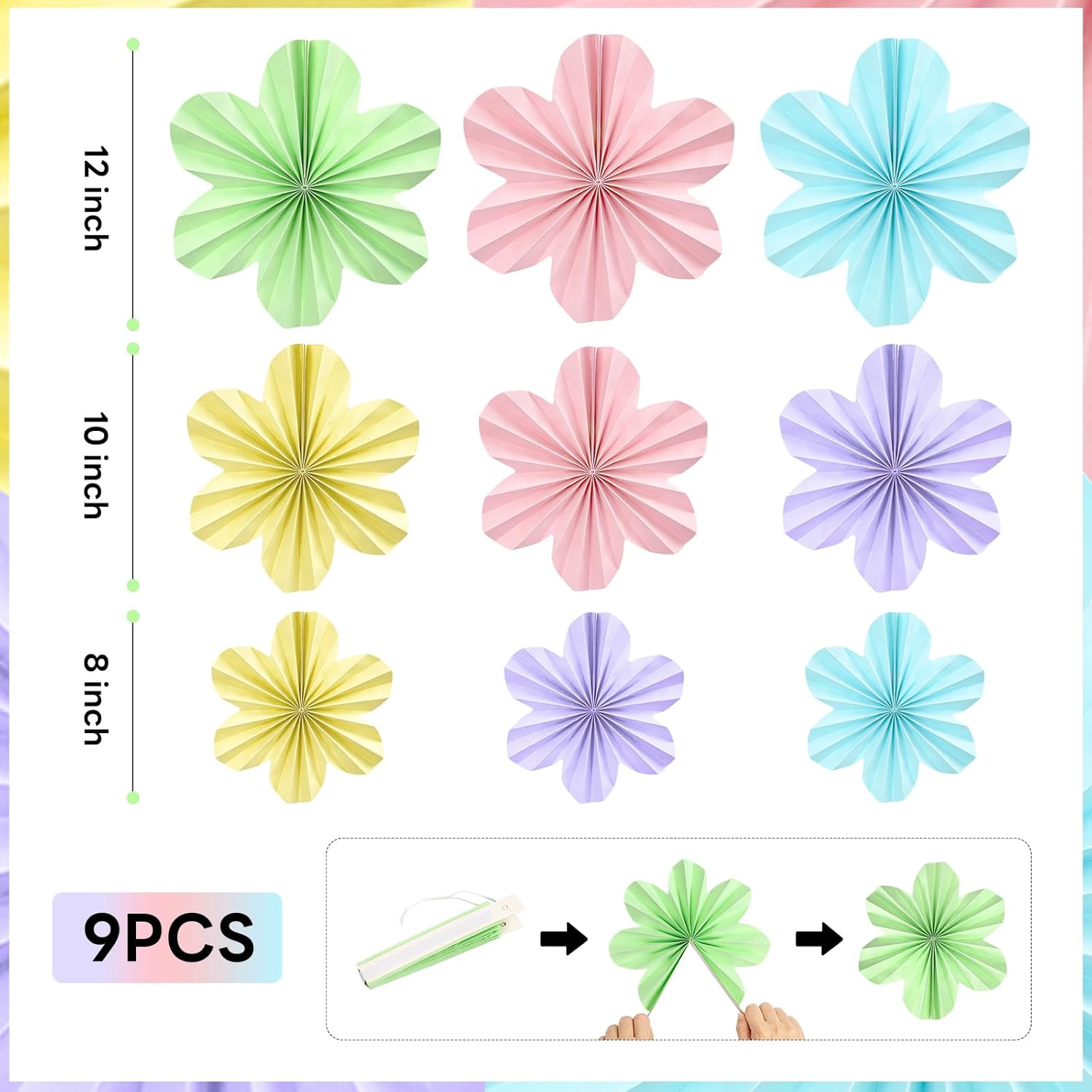 - Pastel Party Decorations: Our pastel paper fans decorations kit includes 3 pcs 12’’ paper flowers, 3 pcs 10’’ paper flowers, 3 pcs 8’’ paper flowers, 10 pcs hanging swirls, 1 pcs 6.56ft tasseled garland, 1 pcs 6.56ft triangular pennants, 2 pcs circle dot garland, 2 pcs ribbon.