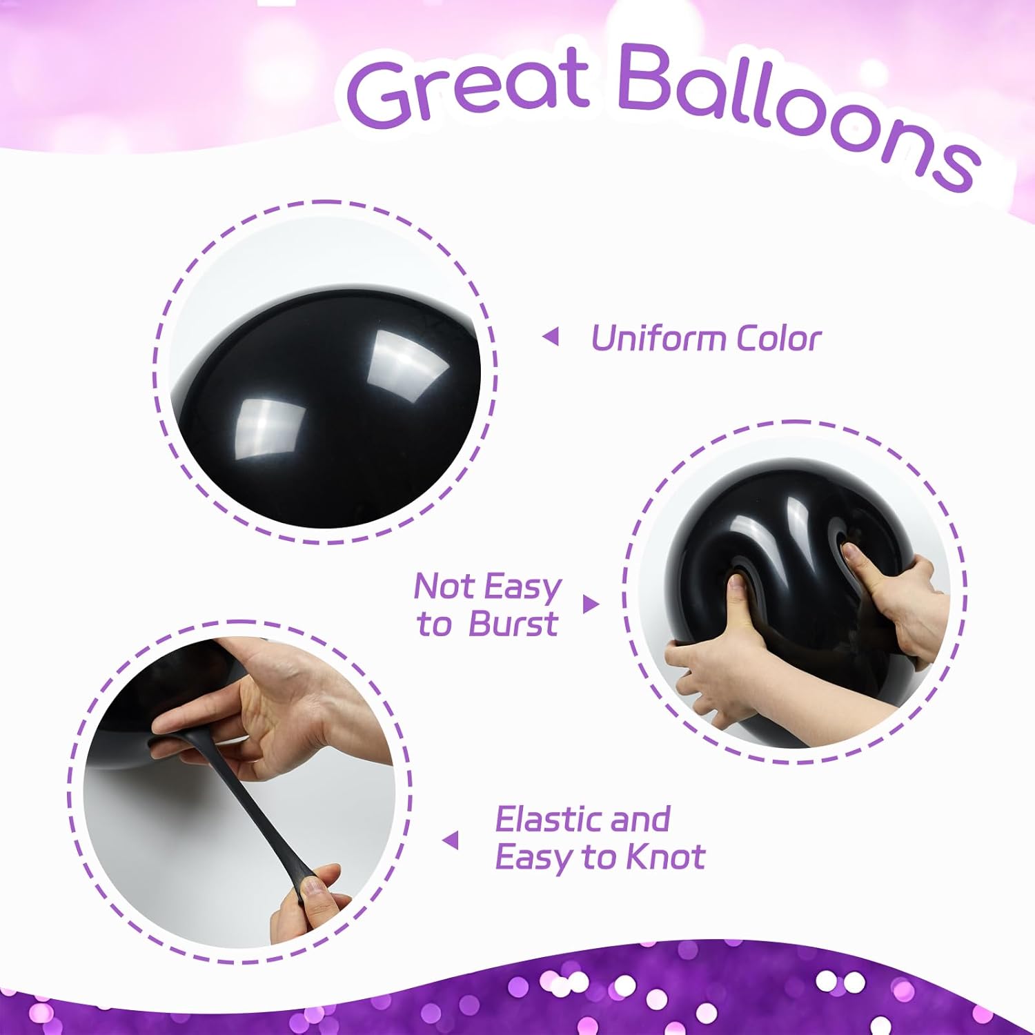 - Great Balloons: The black and purple balloons are made of great latex, it offers great elasticity, thick and sturdy
