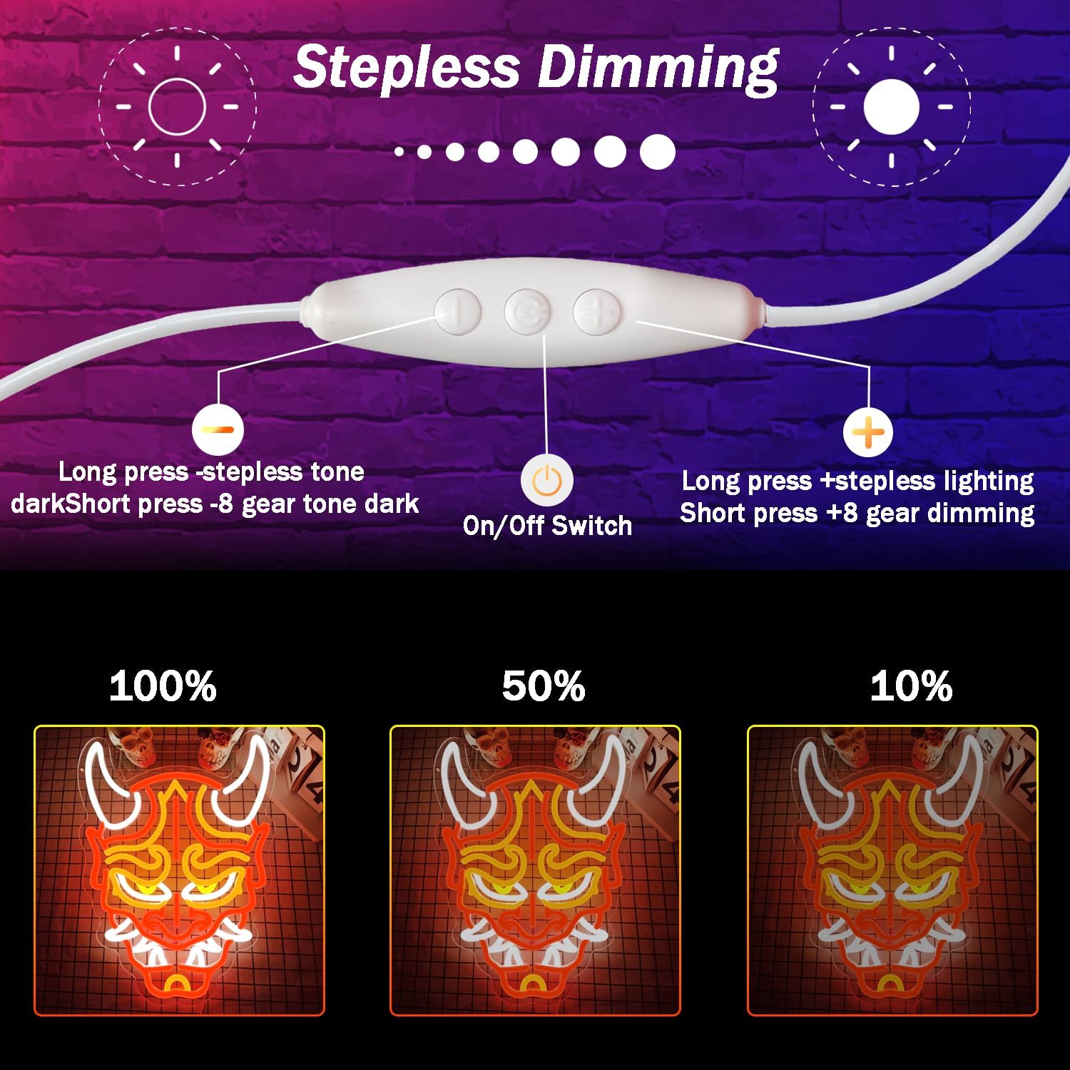 - Easy to Install & Adjust: Setting up this Hannya mask neon sign is simple! It comes with pre-drilled holes and an adjustable light function. Mount it on your wall or display it on your tableinstallation is quick and straightforward. The switch lets you easily turn the light on/off or adjust the brightness to suit your needs.