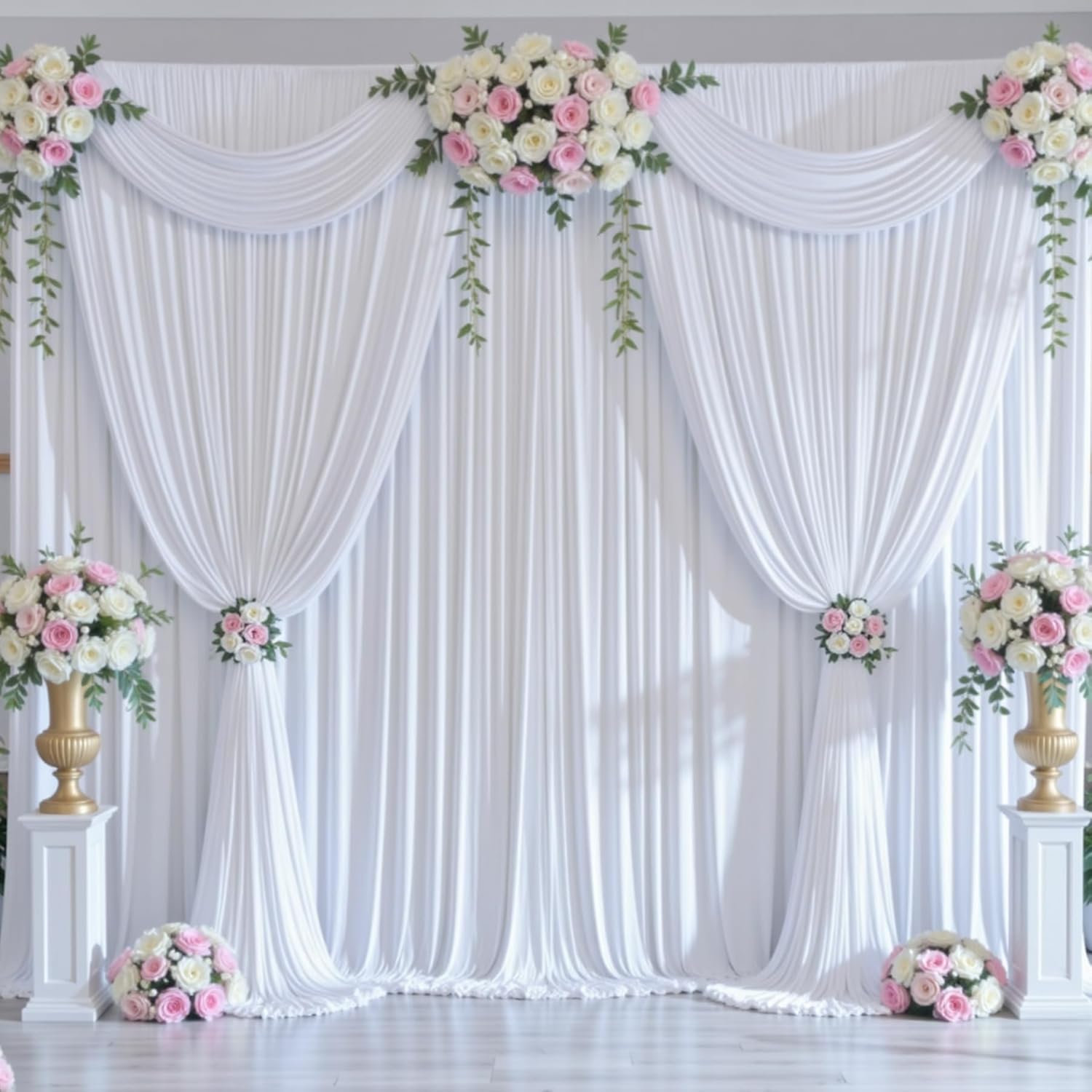 - 10ft Fabric Drape white Backdrop Curtain Wide Compatibility: Polyester photo drape white backdrop curtain can be used for parties, baby shower, wedding, birthday party, photography, bridal shower, gender reveal, zoom, princess party, engagement party, baptism, candy buffets, dessert table, sweet table, background, photo booths, photoshoot, ceremony, anniversary, graduation, home decorations, holiday party, stage curtain or just to mask unsightly areas