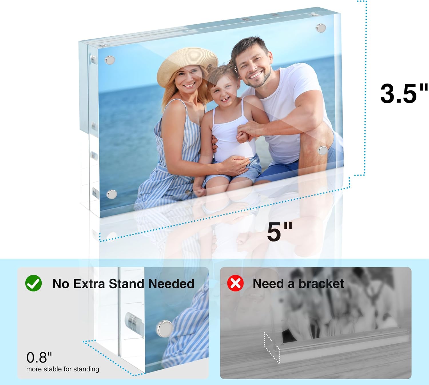 - Premium 3.5x5 Acrylic Frame - Museum-Grade Clarity & Protection, 98% light transmission preserves color accuracy like professional photo paper displays. Ultra-durable, museum-grade acrylic prevents the photos fading and yellowing. Thicker 0.4 in + 0.4 in frame panels resist the warping and scratches, ensuring crystal-clear clarity for decades. Sturdy freestanding build, this acrylic picture frame can hold 3.5x5 in or smaller pictures.