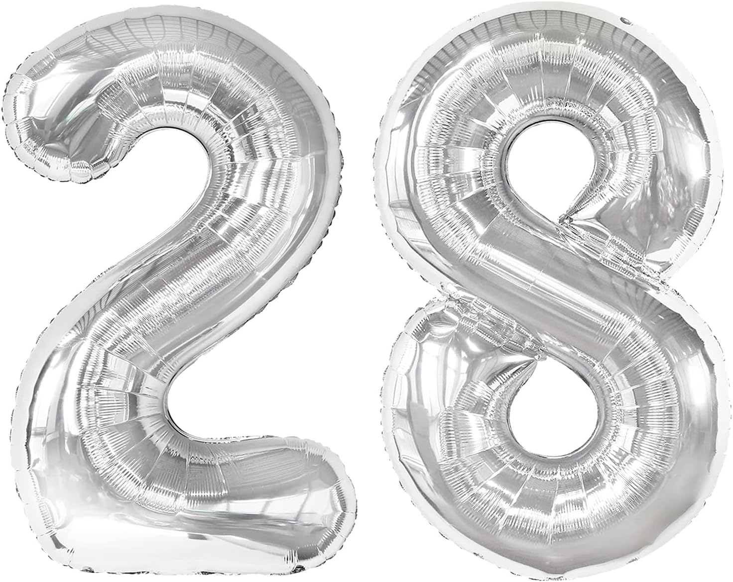 - 1.Elegant Understated Silver Number Balloons: You will receive an uninflated 40 inch number 28 balloon. Big number balloons are always the best statement of romance and surprise. Silver balloons symbolize vitality exoticism, adding glamour to birthday parties. Bright metallic silver and huge size make silver balloons a highlight of special parties. Choose one or more numbers from 0-9 birthday numbers, and use 28 balloon numbers to create a lively and charming party!
