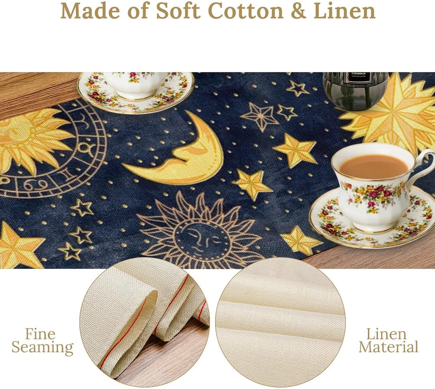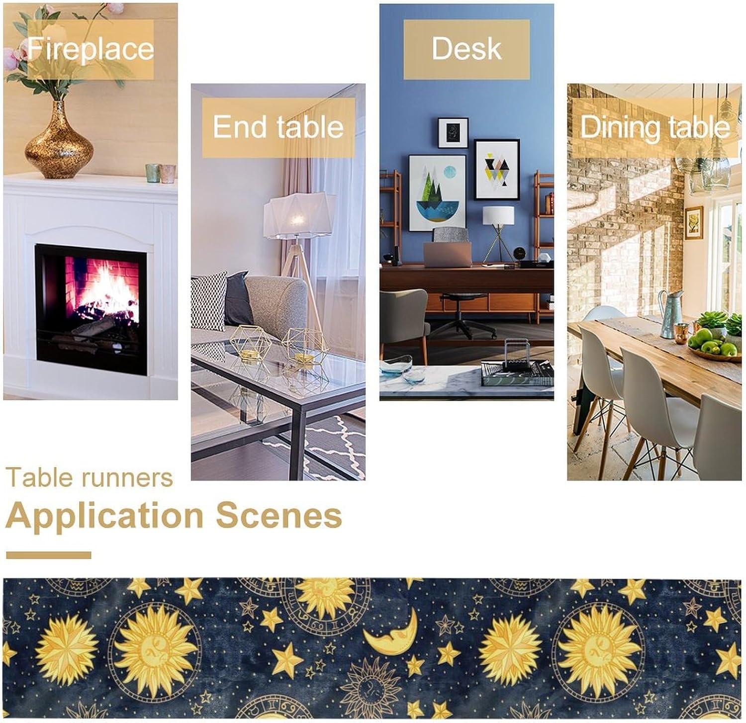 Sun Moon Table Runner, Boho Starry Sky Table Runners for Dinner Holiday Party Wedding Kitchen Golden Stars, 13x120 Inch