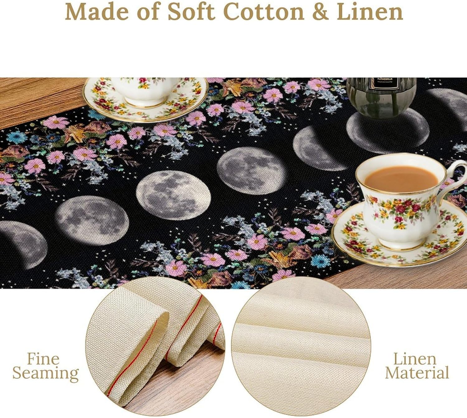 Boho Floral Moon Table Runner, Spring Flower Leaves Mystical Gothic Sun Moon Table Runner for Kitchen Dining Table Home Party,13x90 Inch Purple