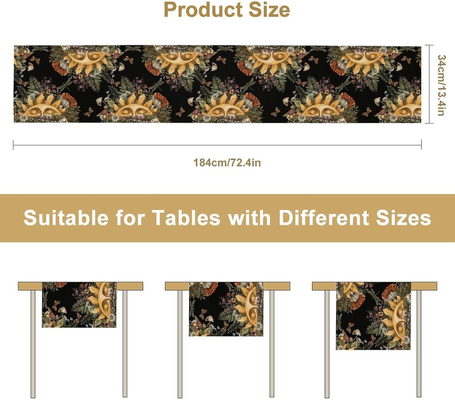 Sun Moon Table Runner, Bohomian Mushroom Daisy Table Gothic Dragonly Butterfly Table Center Decor Table Runner for Indoor Outdoor Party Kitchen Dinner Black, 13x36 Inch