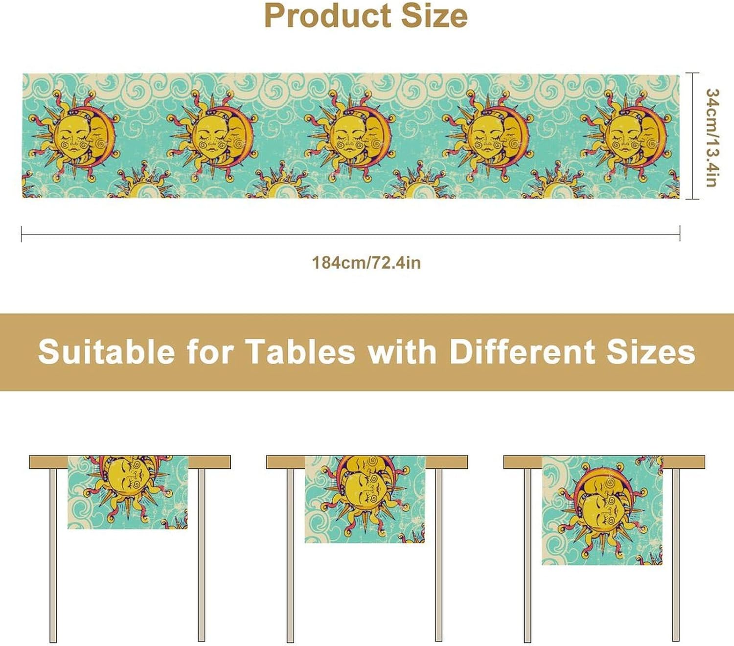 Retro Sun Moon Table Runner, Phase of The Moon Vintage Cloud Table Runner for Kitchen Dinner Living Room Table Runner Yellow Floral, 13x60 Inch Yellow Blue