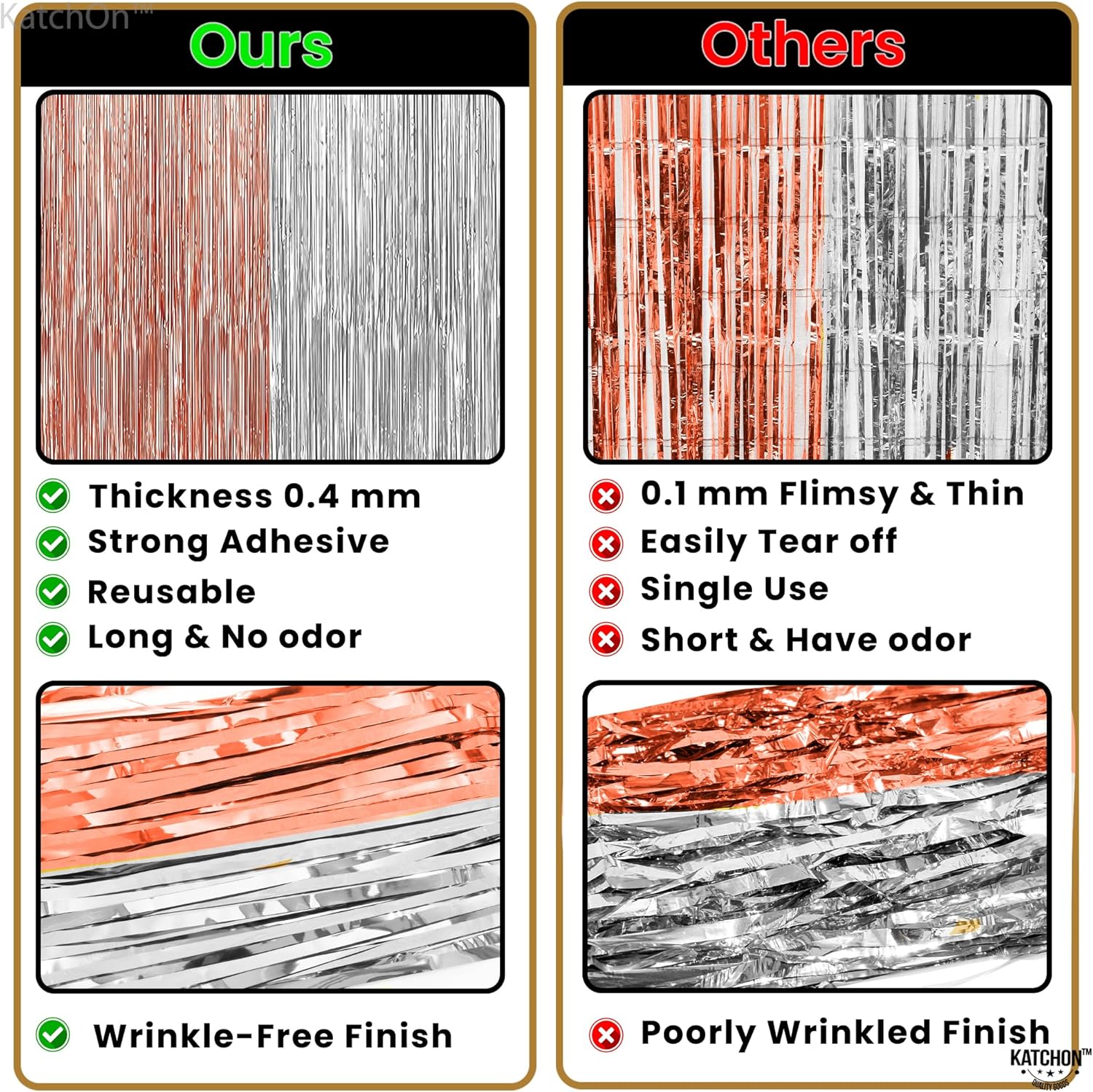 - ELEVATE YOUR EXPERIENCE : Each rose gold and silver fringe curtain comes with adhesive backing, making setup fast and hassle-free if you dont like the product our team is there to assist you. . Use them as rose gold and silver door fringe curtains, rose gold and silver curtain backdrops, or rose gold and silver streamer backdrops to decorate entrances, dessert tables, or dance floors. Lightweight yet durable, these metallic curtains instantly transform plain walls into glamorous photo booth backdrops.