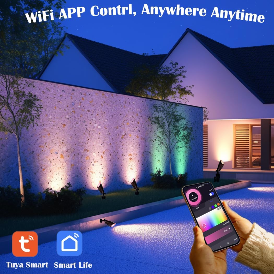 - 2. Smart Voice & App Control: Easily control your outdoor spot lights with Alexa, Google Assistant, or the Tuya Smart Life app. Adjust the colors, brightness, and schedules remotely from anywhere. Whether you're at home or away, you can change the mood or set up automated lighting for added convenience and energy savings.