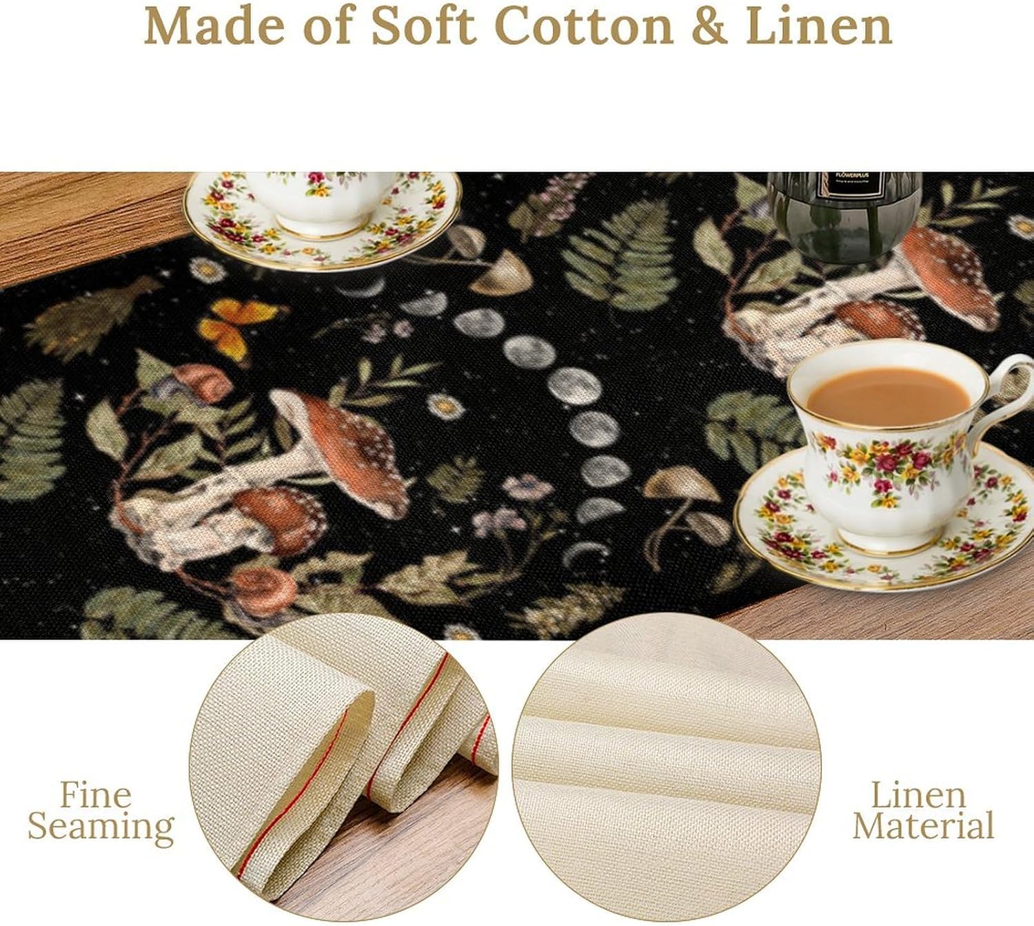 Mushroom Kitchen Table Runner, Boho Vintage Wild Flower Gothic Witchy Moonlit Forest Plant Table Runner for Bedroom Living Room Kitchen Dinner Table, 13x36 Inch