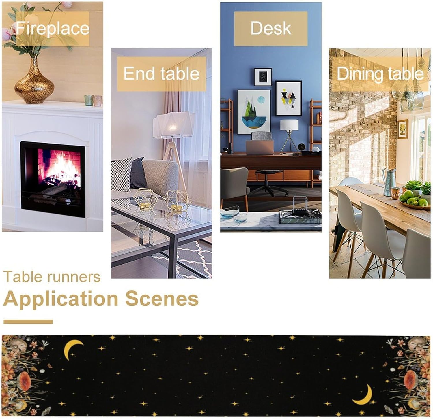 Mushroom Kitchen Table Runner, Gothic Moon Star Plants Witchy Moonlit Flower Butterfly Table Runner for Kitchen Party Living Room Drapes, 13x90 Inch Black