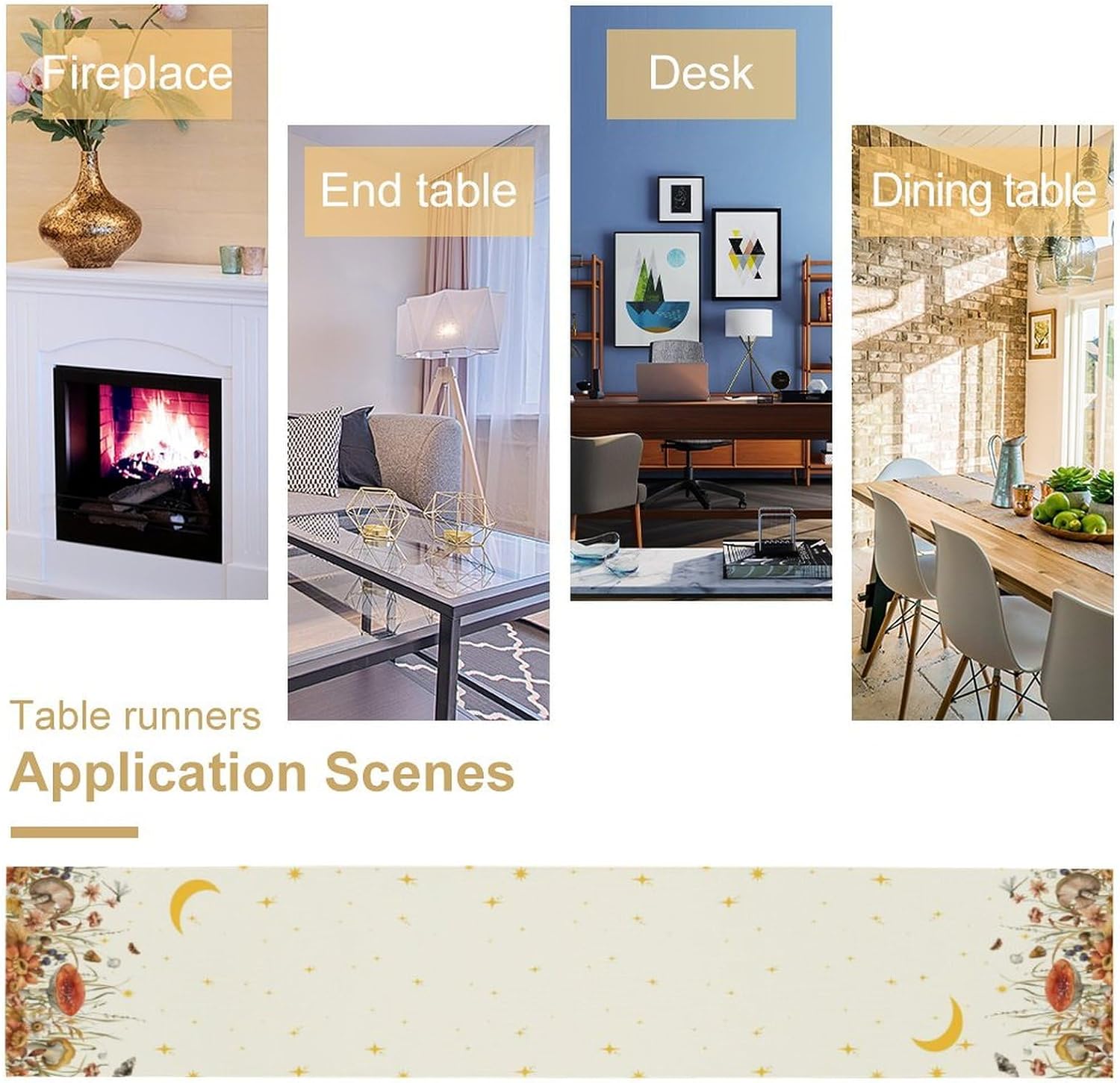 Mushroom Kitchen Table Runner, Gothic Moon Star Plants Witchy Moonlit Flower Butterfly Table Runner for Kitchen Dinner Living Room Drapes, 13x90 Inch White