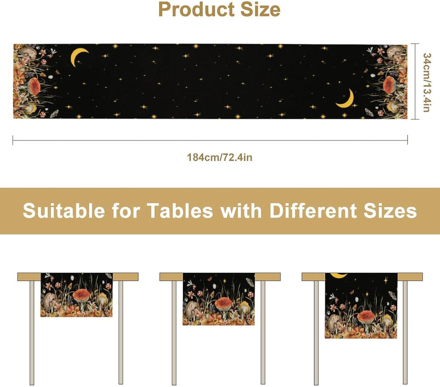 Mushroom Kitchen Table Runner, Gothic Moon Star Plants Witchy Moonlit Flower Butterfly Table Runner for Kitchen Party Living Room Drapes, 13x60 Inch Black