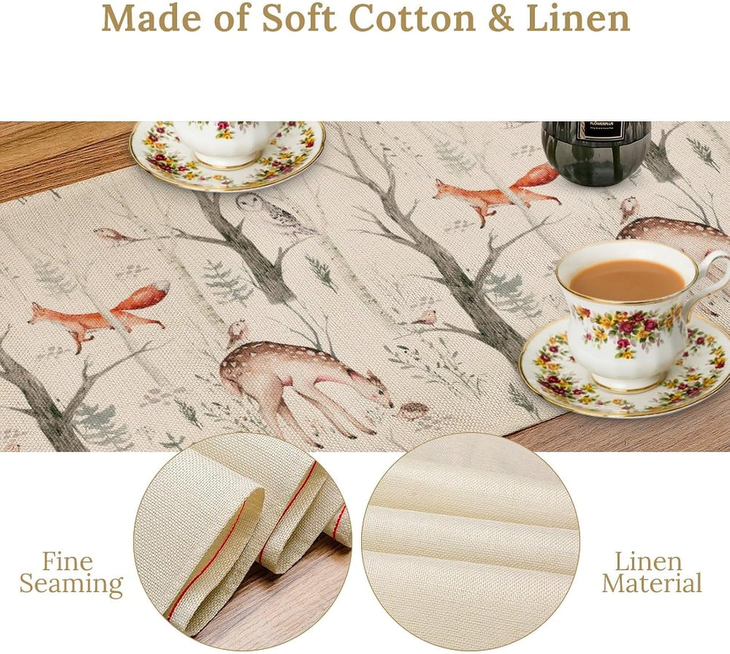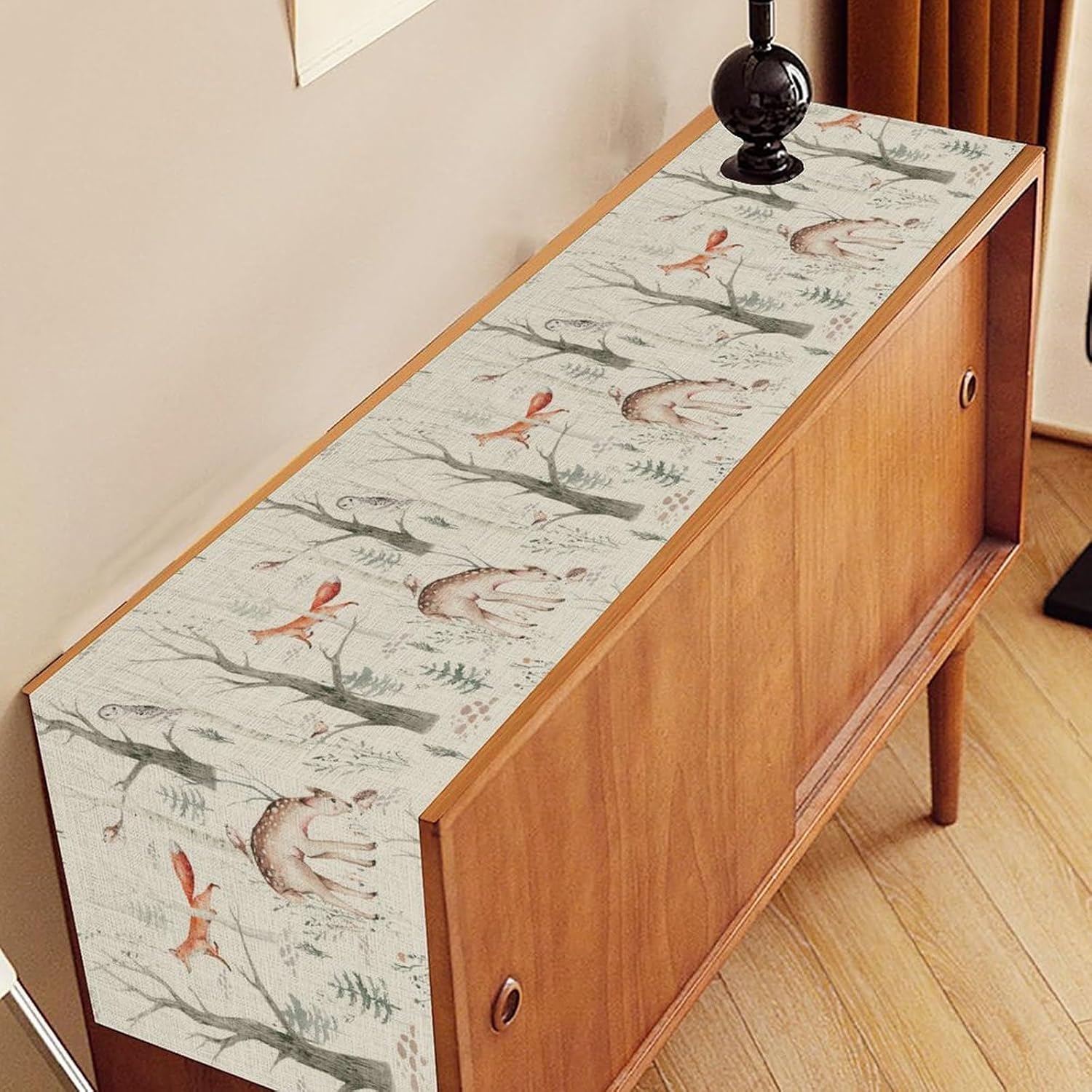 - Various Occasions: The cute table runner widely used in the kitchen, dining room, outdoor table, parties, birthday, or any other special occasion. Suitable for most rectangular table, round table and square table. The watercolor woodland table runners not only as dining table but also tea table, shoe cabinet, washing machine and TV stand, etc. It's also an ideal gift for Christmas, birthdays, weddings or parties as well.
