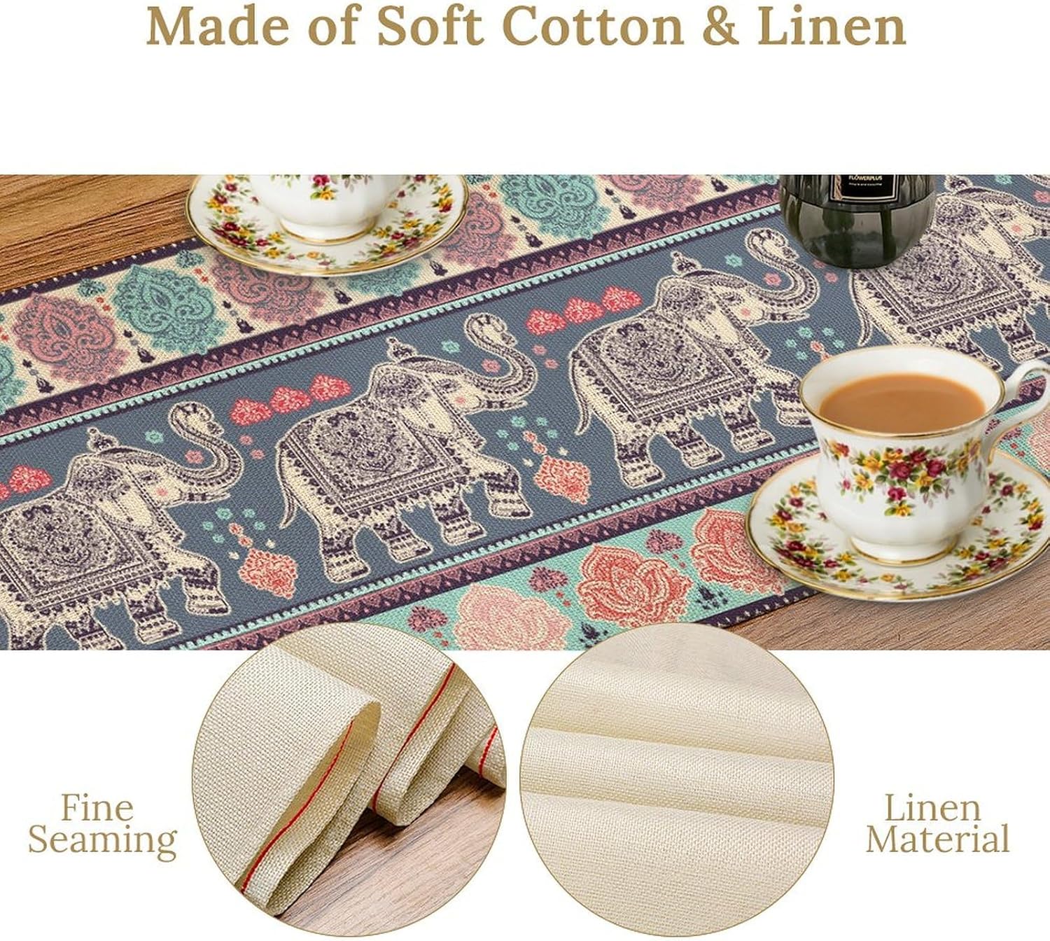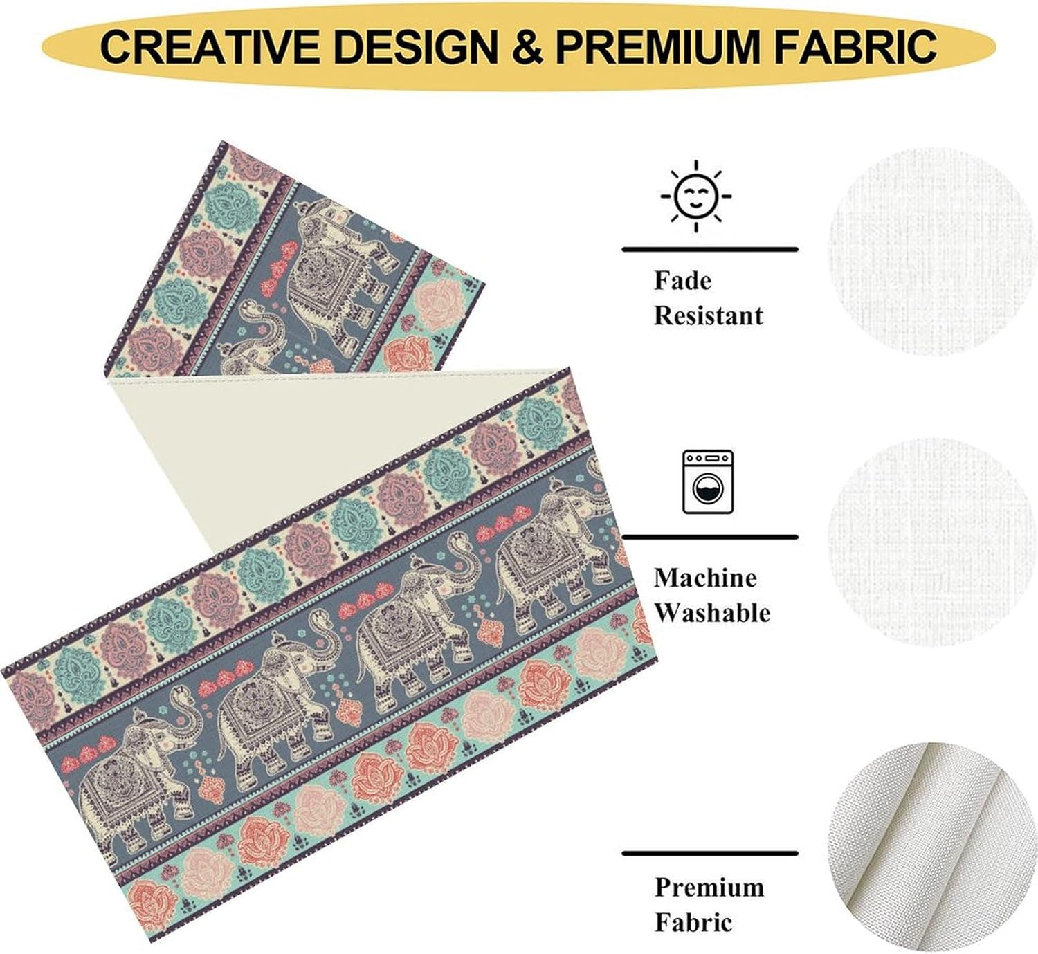 Boho Table Runner, Indian Bohemian Elephant Mandala Paisley Floral Hippie Art Print Table Center Decor for Home Kitchen Dining Patio Holiday Party Indoor Outdoor Table Decorations, 13"x90" Inch