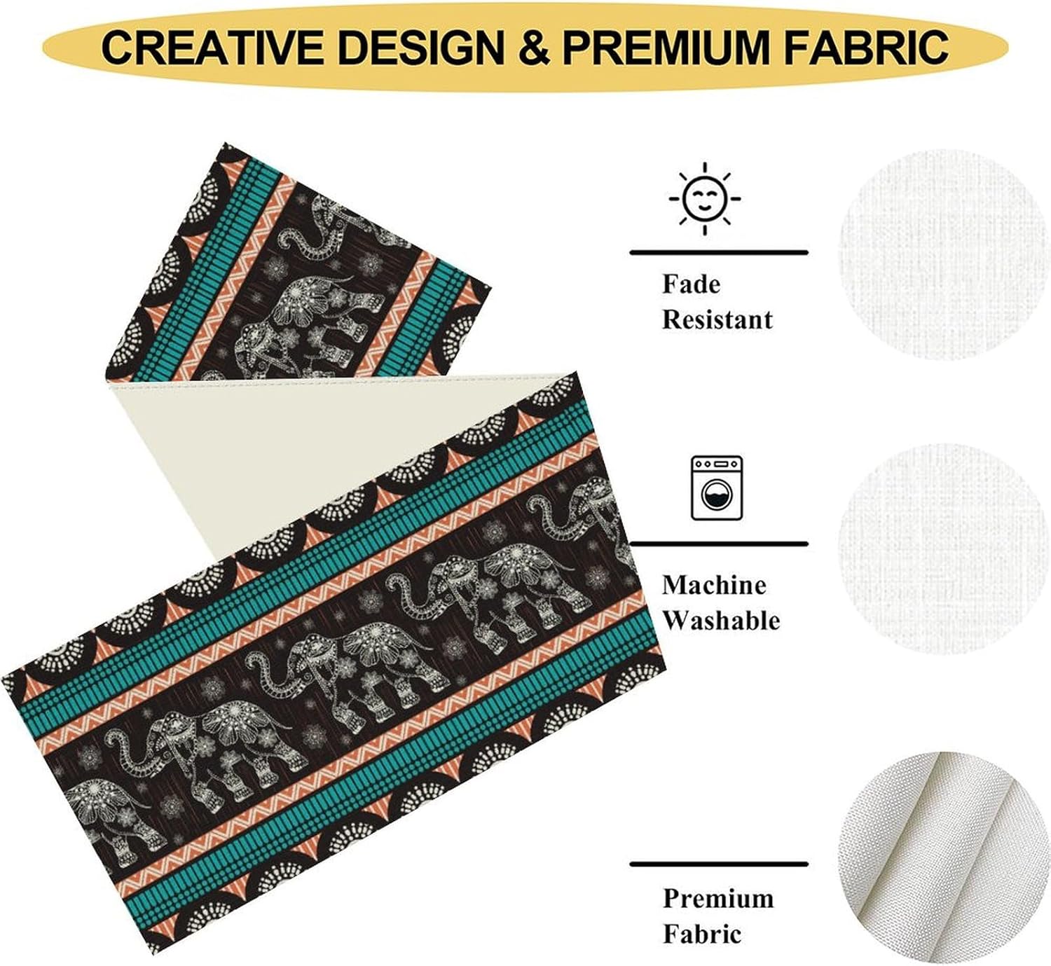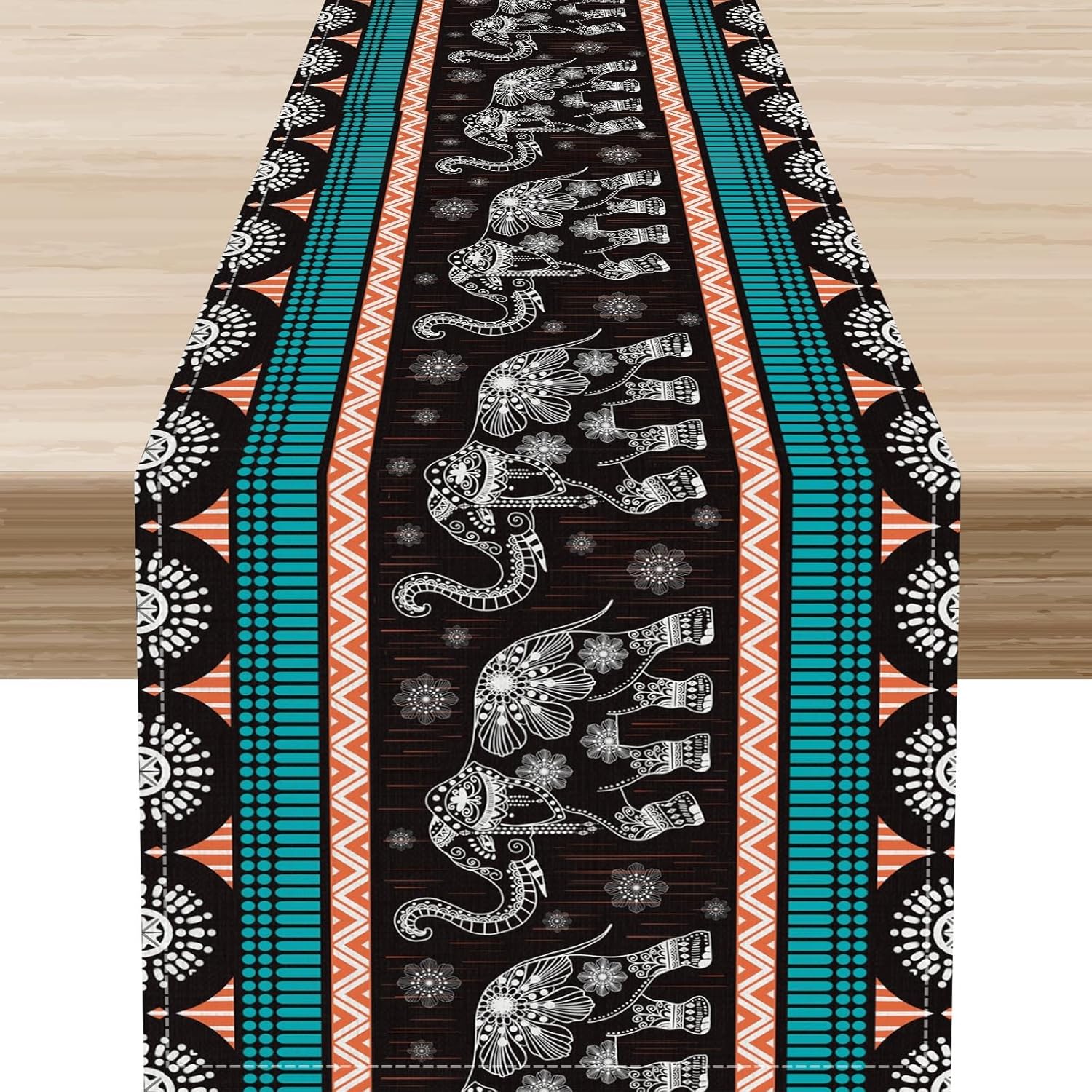 Boho Elephant Table Runner, Vintage Tribal Traditional Bohemian African Animals Ethnic Folk Table Center Decor for Home Kitchen Dining Patio Holiday Party Indoor Table Decorations, 13"x90" Inch