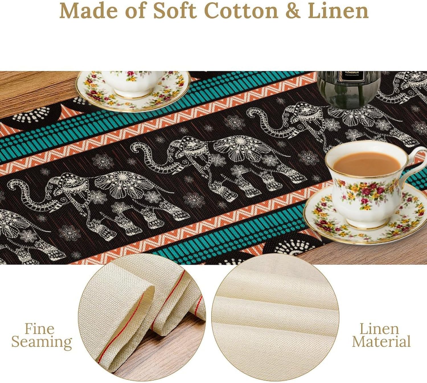 Boho Elephant Table Runner, Vintage Tribal Traditional Bohemian African Animals Ethnic Folk Table Center Decor for Home Kitchen Dining Patio Holiday Party Indoor Table Decorations, 13"x108" Inch