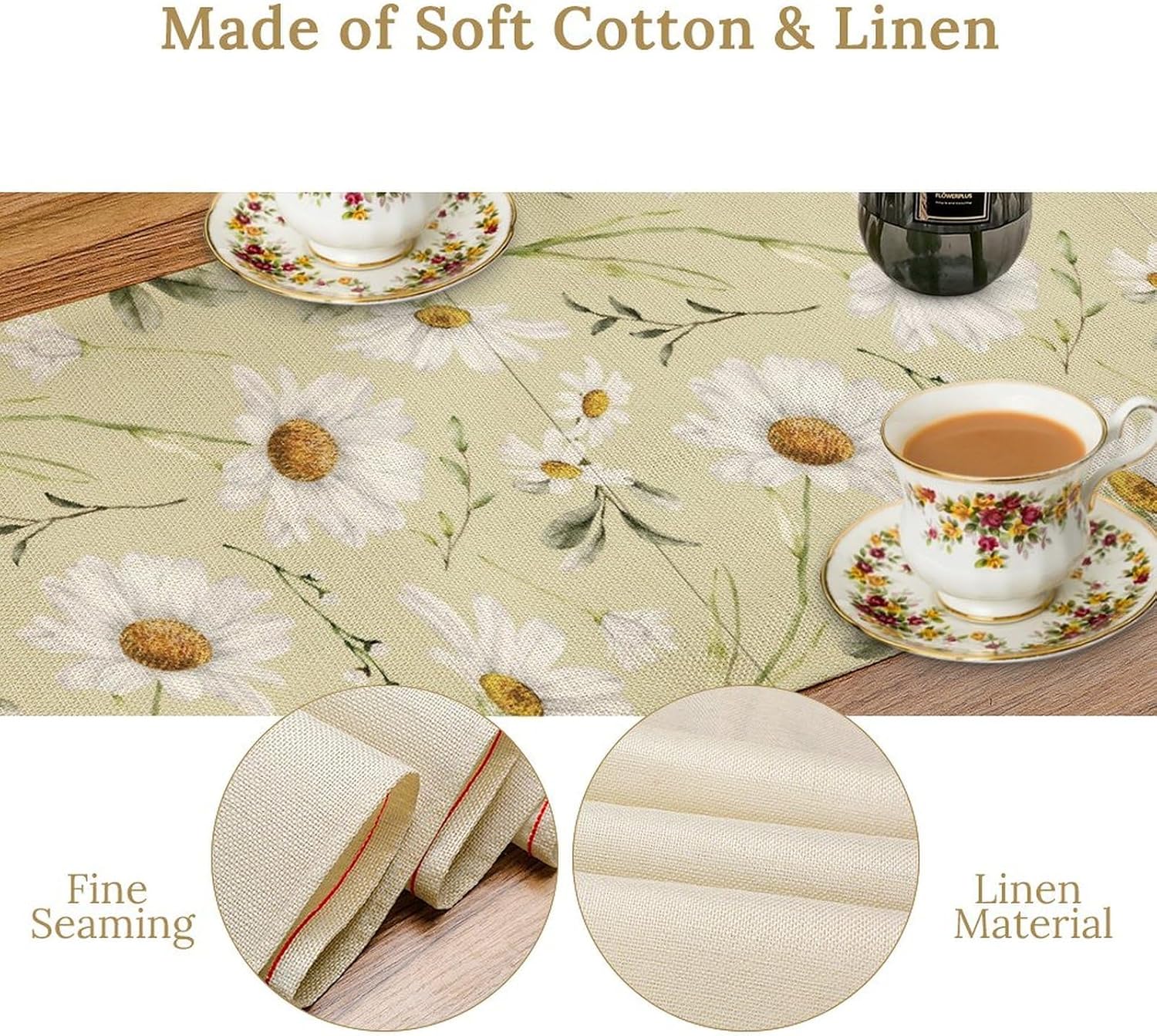 - Various Occasions: The rustic table runner widely used in the kitchen, dining room, outdoor table, parties, birthday, or any other special occasion. Suitable for most rectangular table, round table and square table. The daisy floral table runners not only as dining table but also tea table, shoe cabinet, washing machine and TV stand, etc. It's also an ideal gift for Christmas, birthdays, weddings or parties as well.