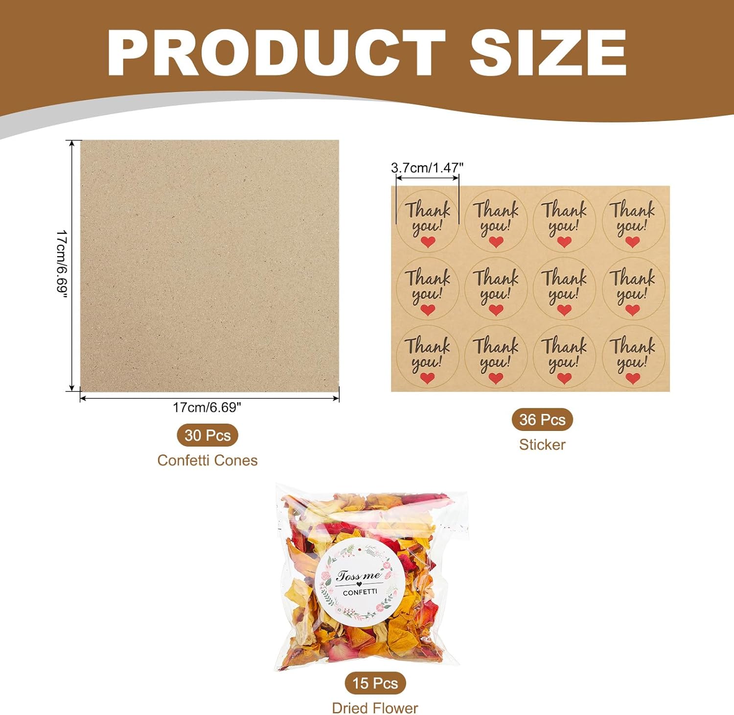 - Material: Paper; Color: Red/Yellow; Paper Cone Size: 17 x 17 cm / 6.69 x 6.69 inch (LxW); Sticker Diameter: 3.7 cm / 1.47 inch; Dried Flower Weight: 160 g / 3.4 qt / 5.75 oz; Package List: 30 Pcs x Confetti Cones, 15 Pcs x Dried Flower, 36 Pcs x Sticker
