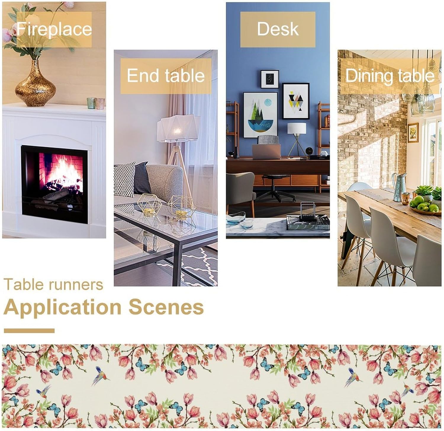 Flowers Table Runner,Floral Bird Butterfly Spring Table Cloth Kitchen Dining Table Home Party Decoration 13x108 Inch