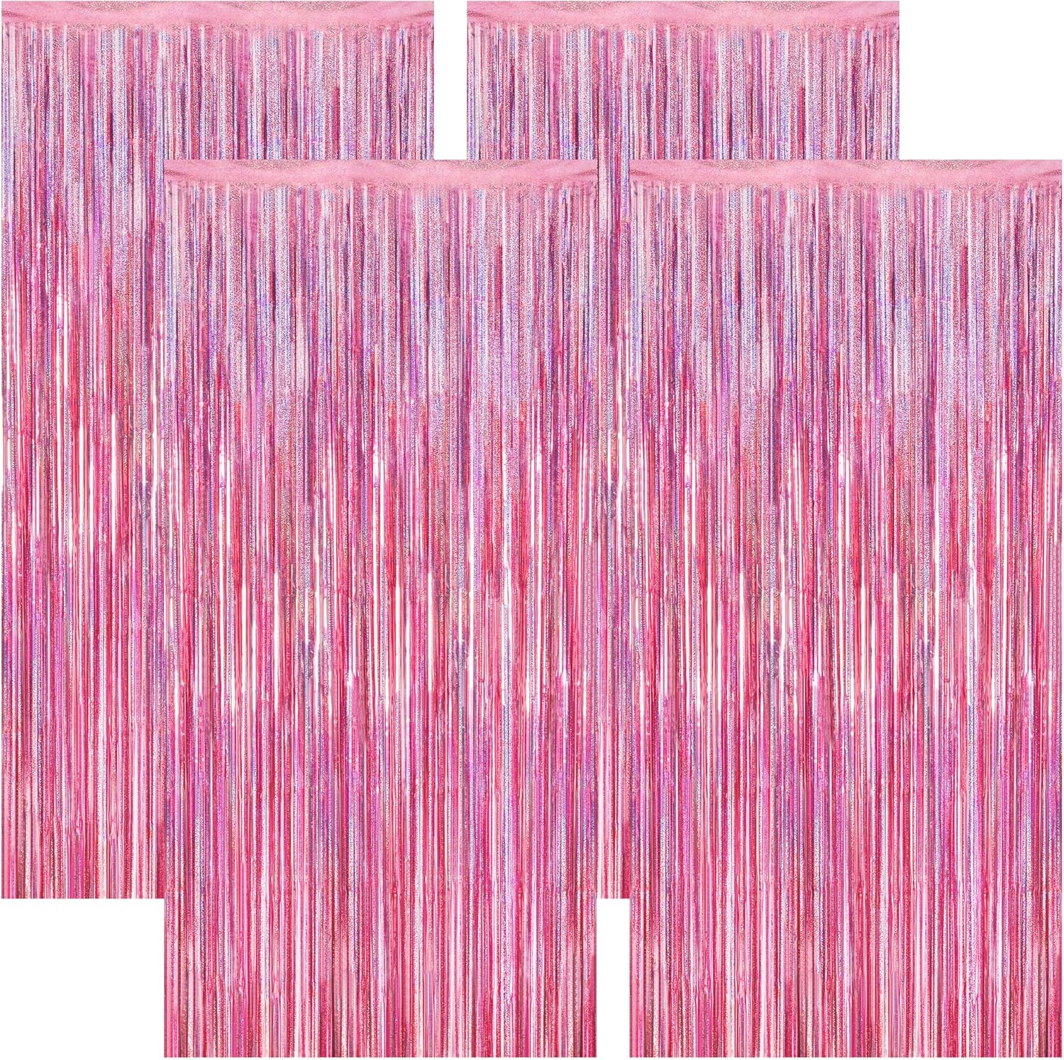 4 Pack Pink Backdrop, 3.28 FT x7.05 FT Foil Fringe Curtains, Metallic Glitter Pink Streamer Fringe Backdrop Foil Curtains, Laser Pink Birthday Party Decorations Bachelorette Decor