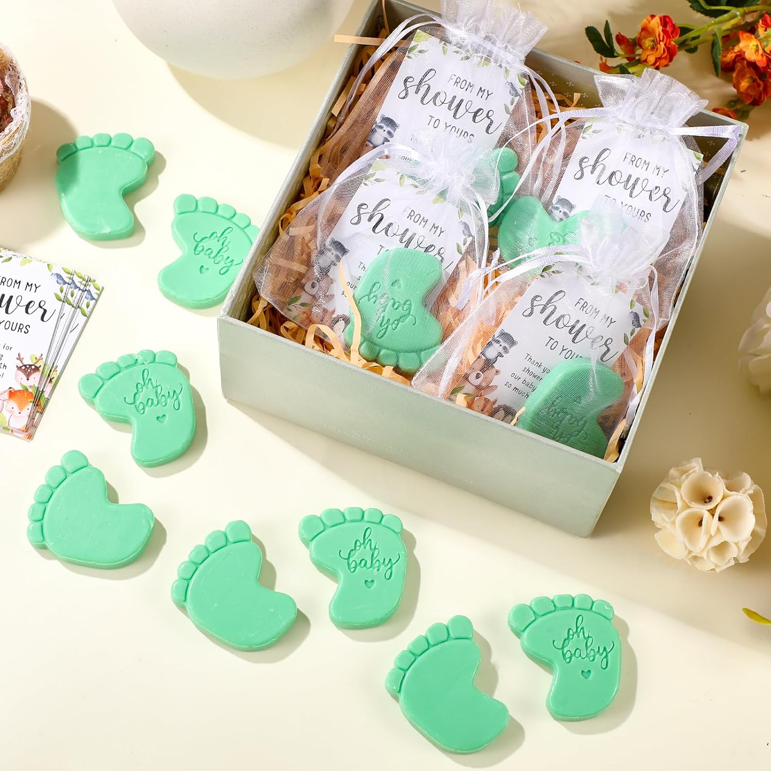 - Baby Shower Soaps: these baby shower soaps are made from natural vegetable oil soap base and glycerin, ensuring skin friendly and smooth usage; The package is a complete set containing 50 handmade soaps, 50 thank you cards, and 50 organza bags, making it a comprehensive and excellent gift choice for your guests