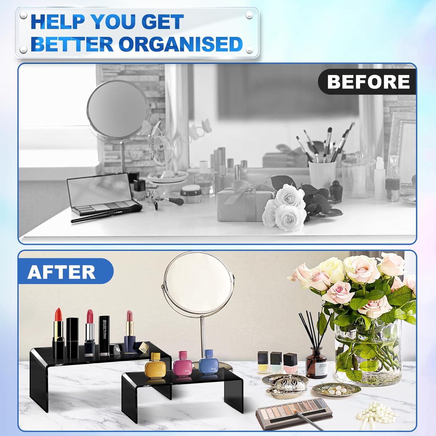 - Reusable & Cleanable:These display stand are also very easy to use, no assembly required no splicing, just put them in the right place for the items you need to display or organize! These acrylic risers display stands are washable and reusable. Simply wipe perfume stand with a damp cloth with warm water and the dust on the tiered shelf stand will disappear, very convenient. It won't hurt to use it again afterwards