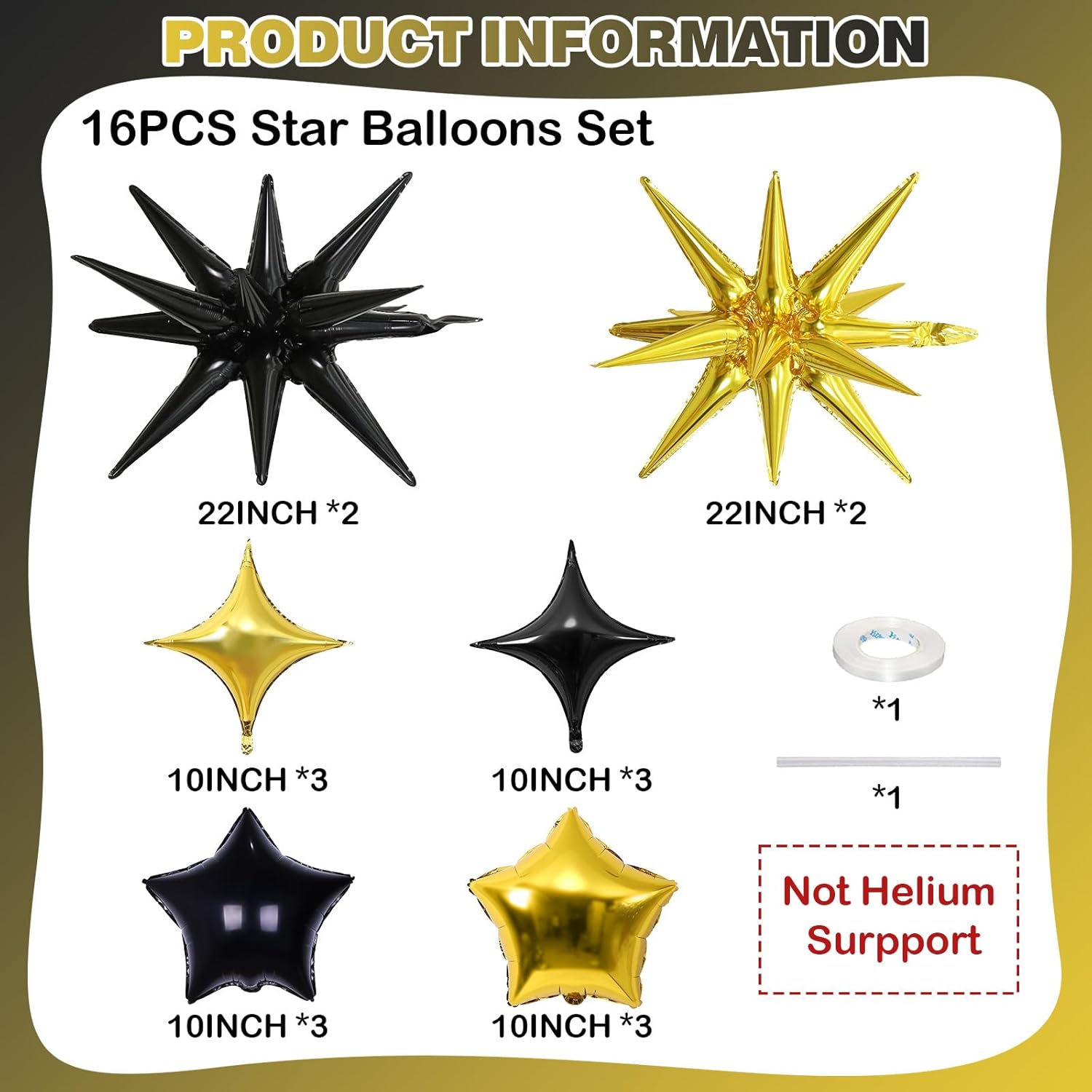 - Black Gold Balloons Set: Package includes: black, gold two-color aluminum foil star balloons (explosion stars × 4, four-pointed stars × 6, five-pointed stars × 6) , a straw and ribbon