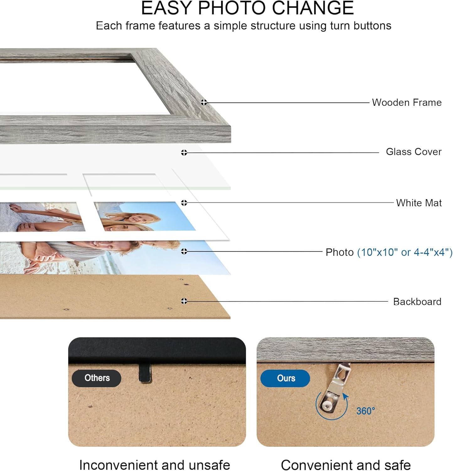 - Fit for 2 Sizes Photos - This 10 by 10 picture frames can display 10x10 picture without mat, 4 open 4x4 picture with mat. The actual mat opening was designed slightly smaller than photo itself in order to hold it steadily while not a defect