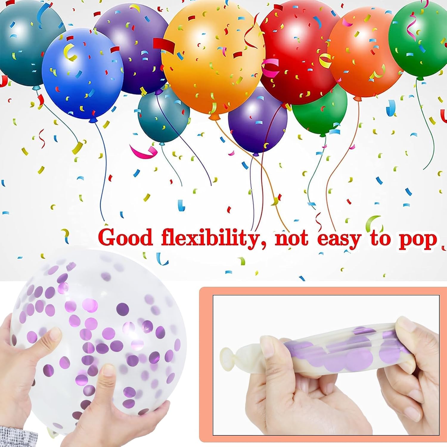 - The balloons are made of high quality natural latex: high elasticity cut ductility, inflatable and not easy to burst, can be stretched to 12 inches full and round. Macaron pink and purple advanced color scheme: low saturation and gentle tone, healing atmosphere gods. Sequins evenly suspended, shaking that is scattered river of stars, forever girl heart!