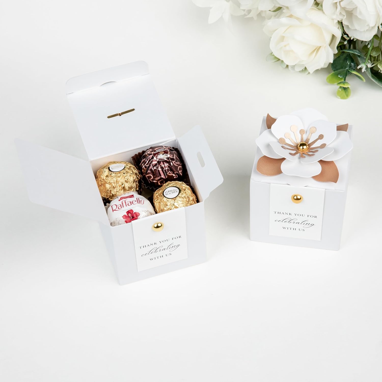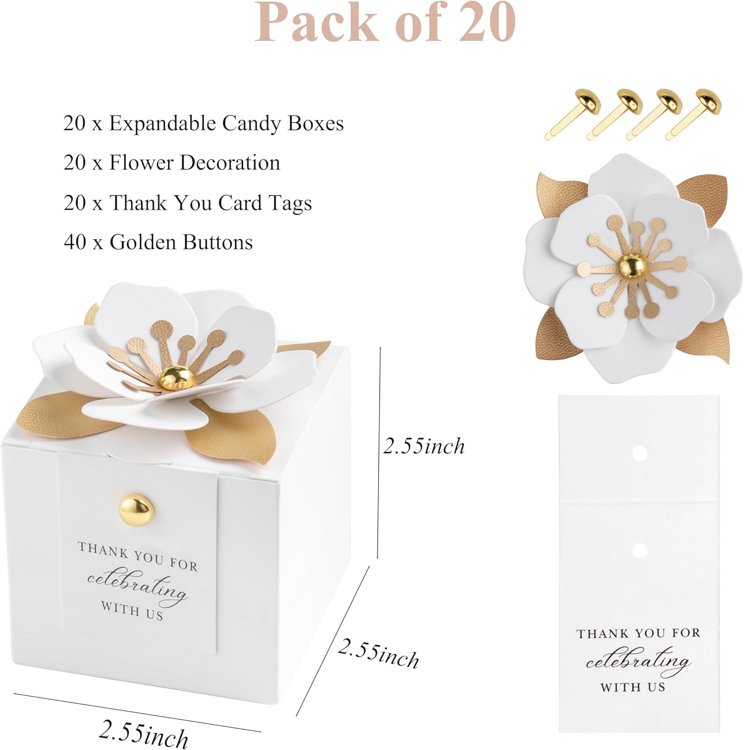 - 【3 in 1 favor boxes】: Include 20* unfold candy boxes, 20* white flower decor, 20* white thank you tags, 40* gold buttons. (The boxes need to be folded by yourself)