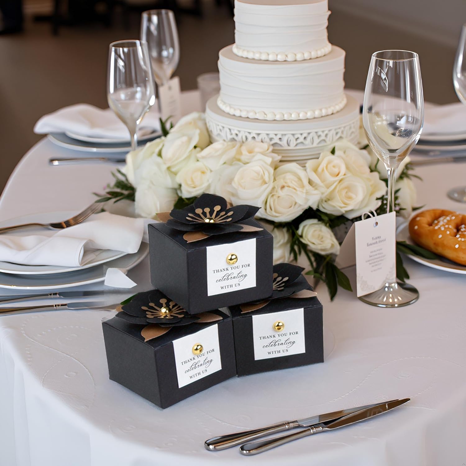 FEIYI 20 PCS Candy Boxes, 3 In 1 Black Favor Boxes with Floral Decor, White Thank You Tags Gift wrapping for Wedding Birthday Baby Shower Decorations Party -2.55x2.55x1.77''