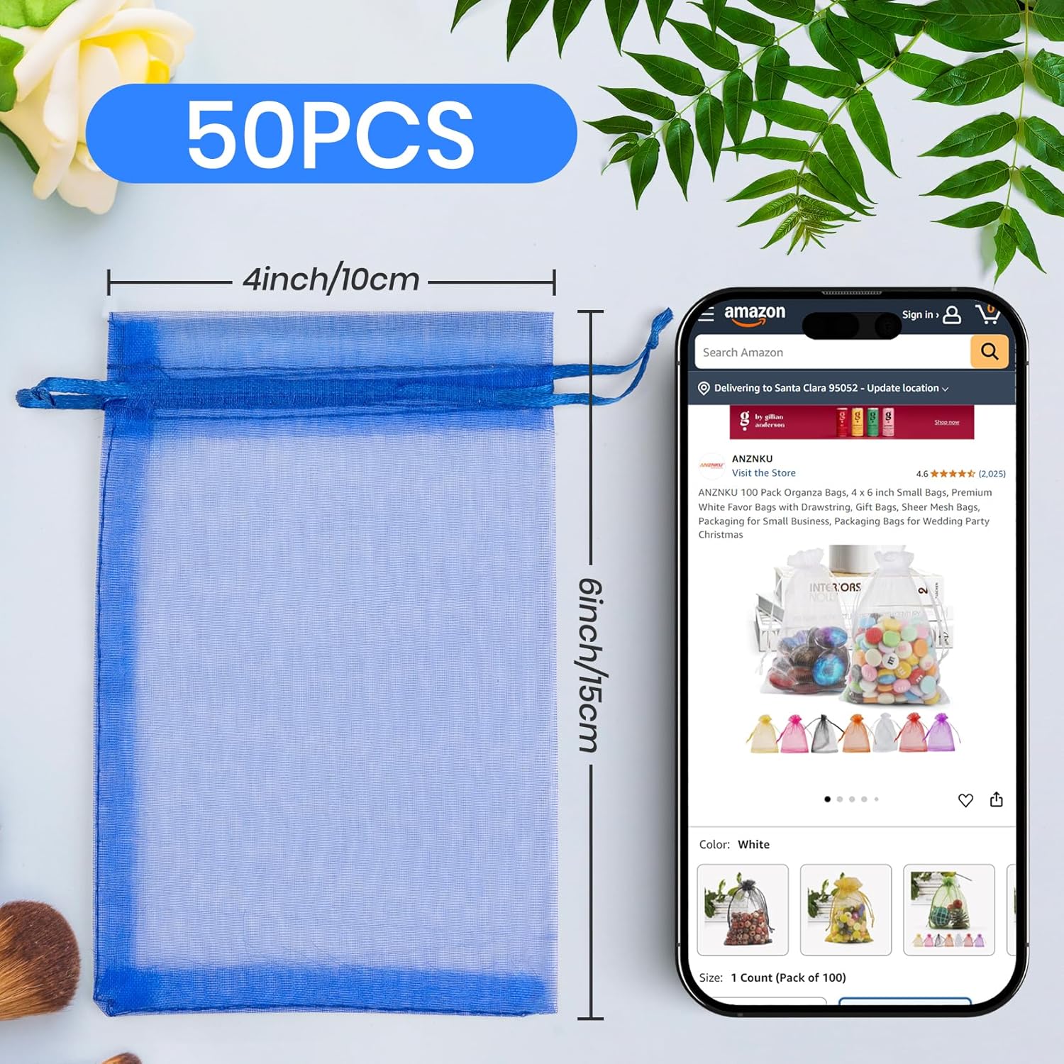 ANZNKU 50 Pack Organza Bags 4x6 Inch, Small Mesh Bag Drawstring Jewelry Pouches, Organza Gift Bags for Baby Shower, Party Favors(Royal Blue)