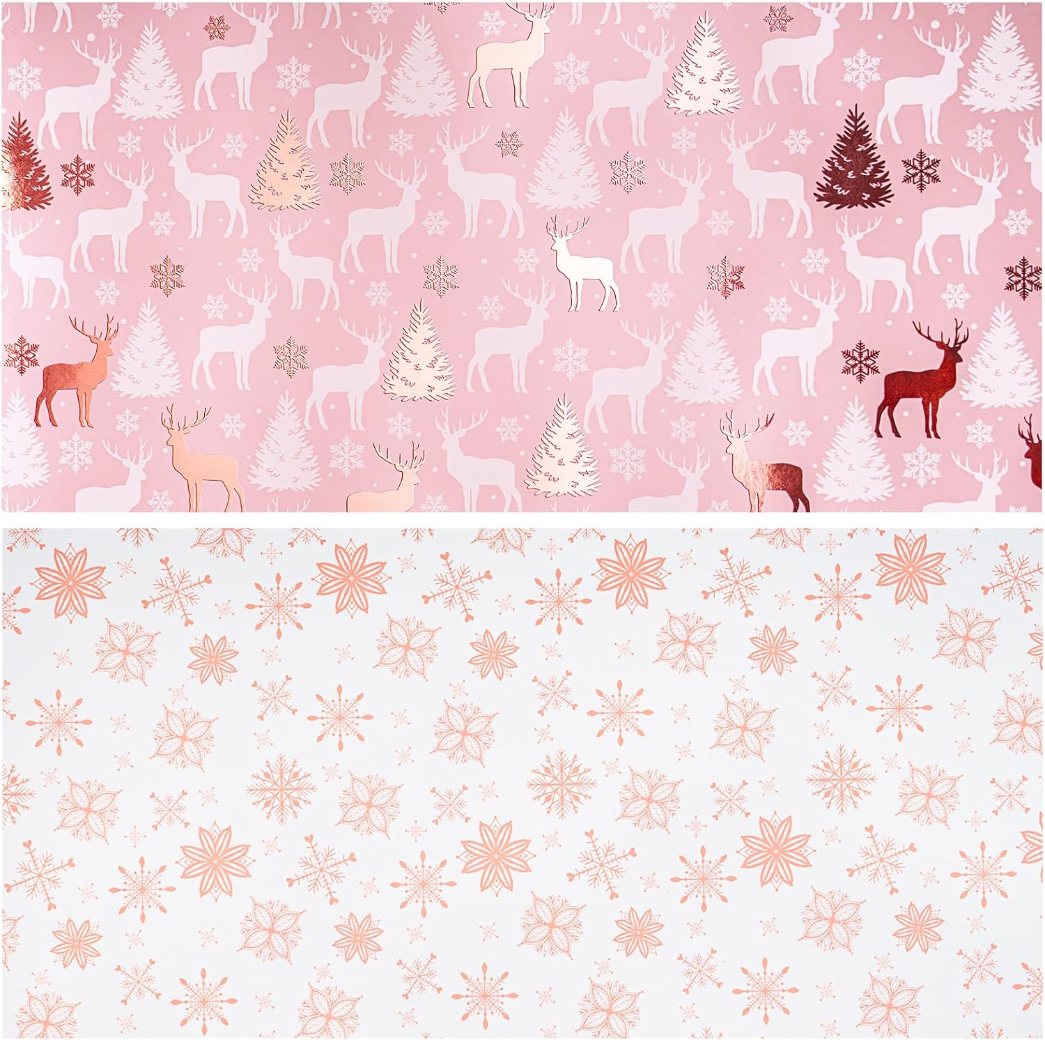 - Double-Sided Festive Design with Metallic Foil: One side shows reindeer silhouettes, Christmas trees, and snowflake accents in rose gold foil on a pink background; reverse side features rose gold foil snowflakes on a white background for versatile looks.