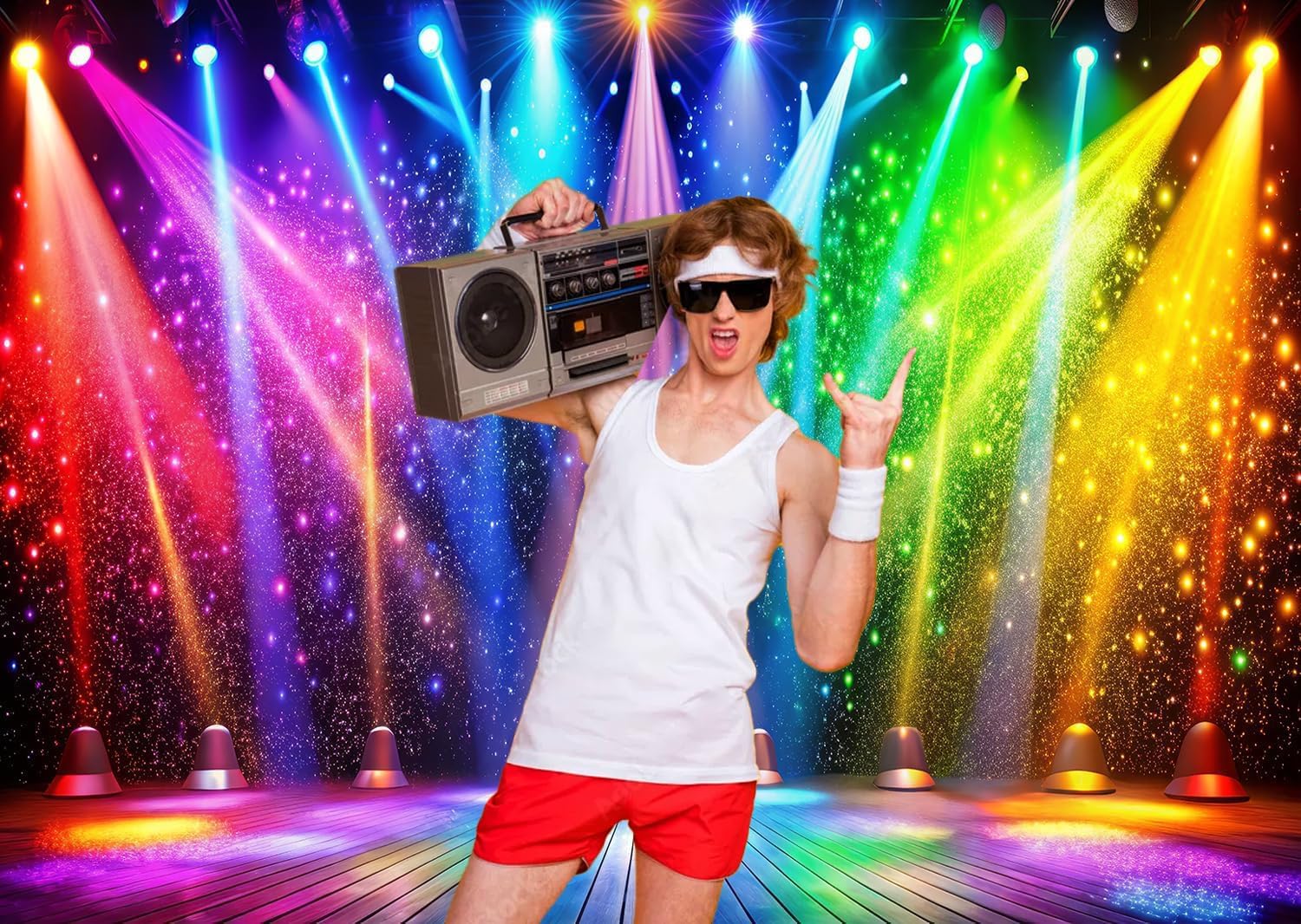 - π Vibrant Rainbow Light Design β Featuring a dazzling array of rainbow spotlights and glitter effects, this backdrop instantly creates a festive atmosphere for parties, concerts, or photoshoots.