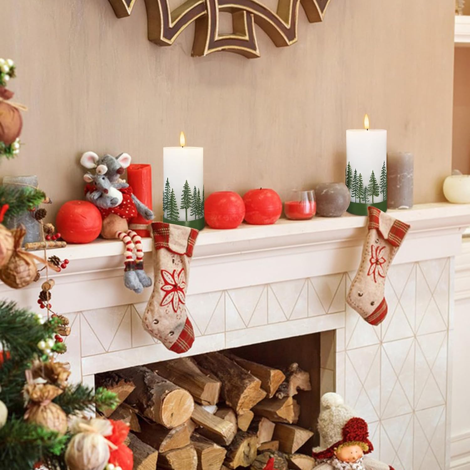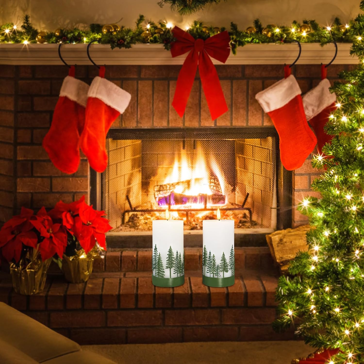 - CHRISTMAS DESIGN FEATURES: Set of 2 Christmas decorative LED candles, designed with a beautiful pine forest silhouette, hand-painted with green base decoration