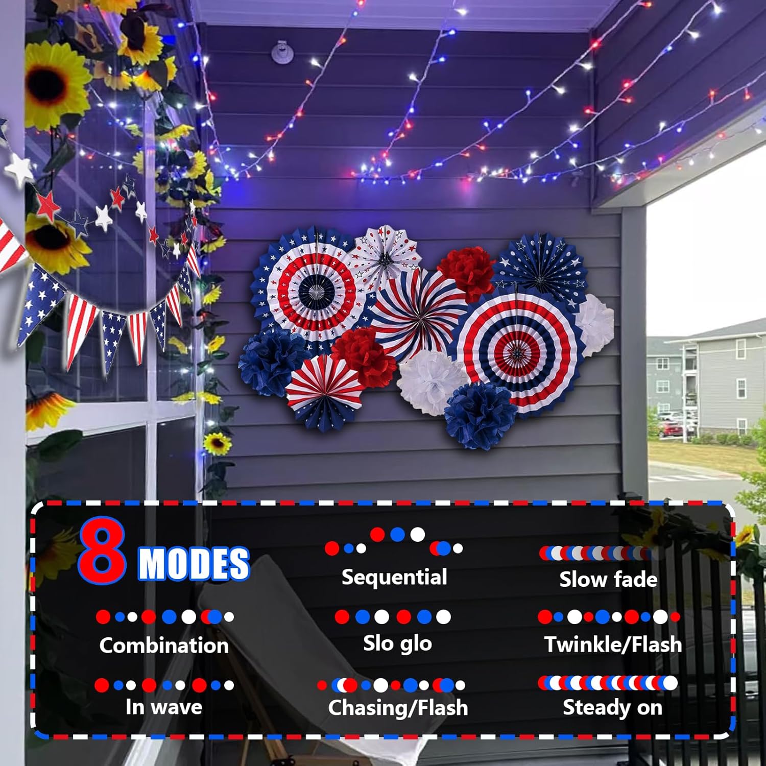 - 8 Lighting Modes: Patriotic string light has 8 lighting modes (combination, in wave, sequential, slo-glo, chase/flash, slow fade, twinkle/flash, steady on). Different lighting effects are controlled by the adapter button. Change the mode as needed to attract and surprise your neighbors! String lights will be a eye-catching decoration at your holiday.