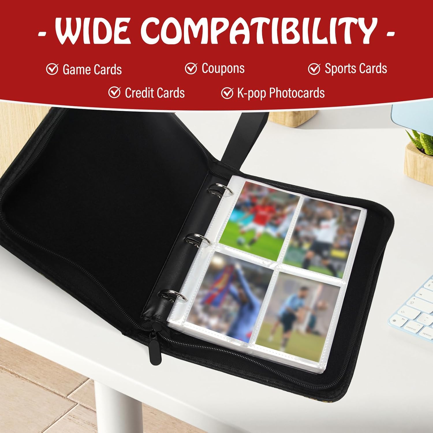 - Large Capacity Size: Inside page size: 2.68*3.5in,The card binder comes with 50 removable sleeves, which can hold up to 400 trading cards with 4 pockets on each side, allowing you to store cards on both the front and back.The trading card binder case is compatible with svarious standard-sized cards, Game Card , Football cards, Baseball cards