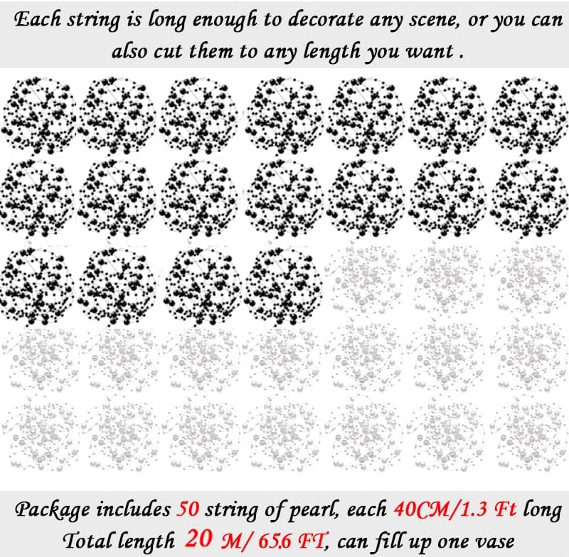 - String of Pearls: You will receive 50 pieces of pearl string (1.3 feet each) total 65 feet of pearls, artificial string beads strand, each strand consists of some large beads and small beads, the beads string are available in two sizes of 8mm and 3mm, the quantity is enough to satisfy your different decorative and DIY needs and party use needs, the pearl string beads are suitable for floating candles water centerpiece and wedding centerpieces, make your space full of elegance and modern style