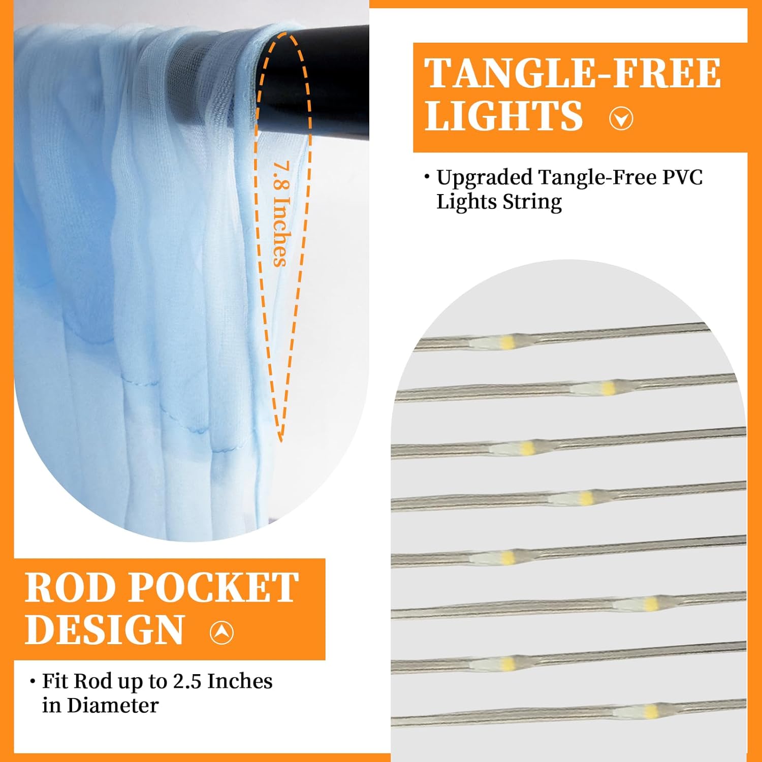 - Easy Setup & Reusable Decor: Designed for convenience, the tulle curtain features a 2.5-inch rod pocket for easy hanging on pipes or stands. Includes 12 Transparent clips make the lights simple to hang and secure to the backdrop, adding a warm, inviting glow. Reusable and easy to store, this set is perfect for multiple events