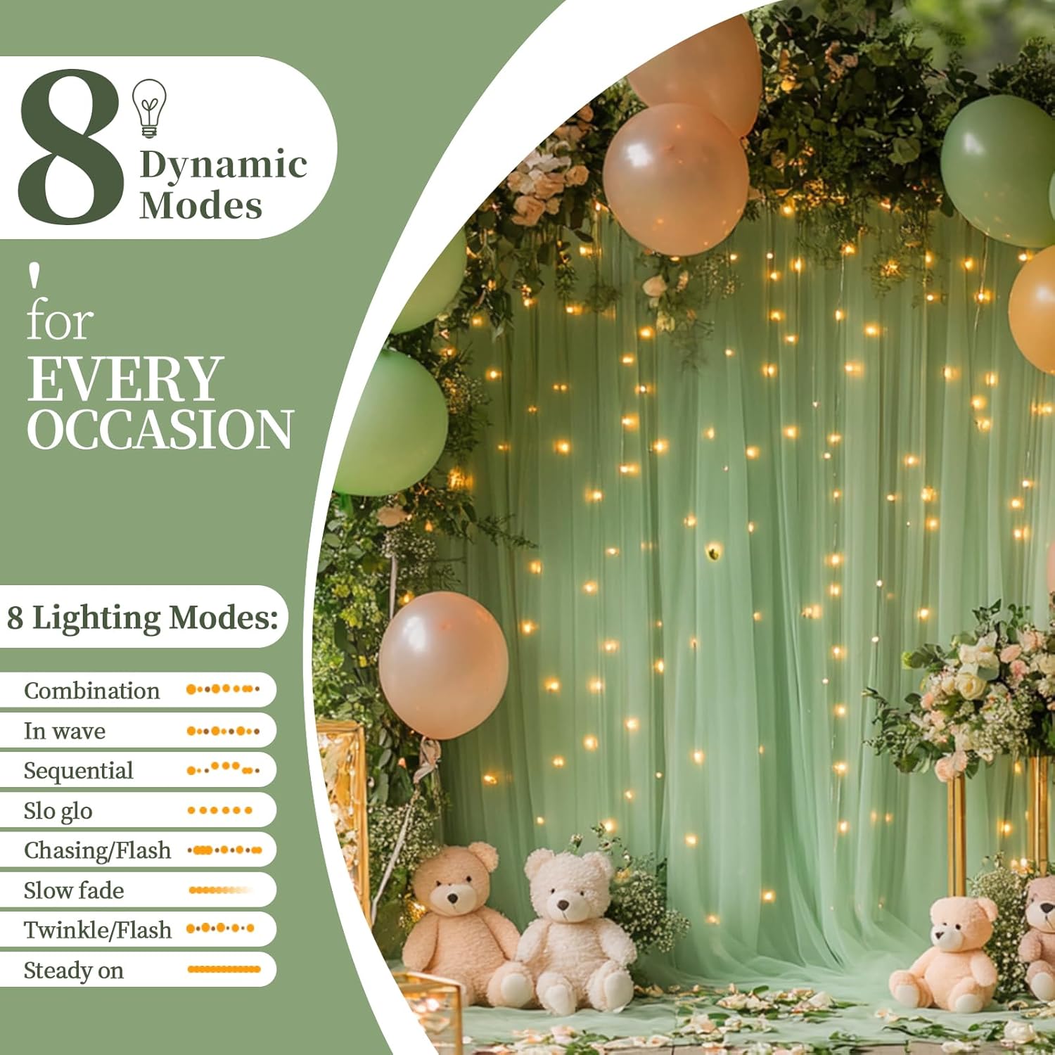 10x10ft Green Tulle Backdrop Curtain with String Lights, Wrinkle-Free Sheer Wedding Backdrop for Birthday Parties, Baby Showers, Bridal Showers, Photo Shoots and Home Decorations, Green