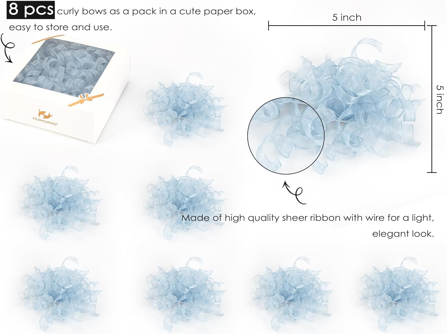 - SIZE & PACK: Each package contains 8 pcs dusty blue curly bows, and made from 12 strands of 3/8"(9mm) wide sheer ribbon that adds a light, airy, and luxurious feel to any gift or decoration. Bows measures 5"~5.5" wide, create a dramatic and burst effect, making it ideal for large gift boxes, baskets, and decorations