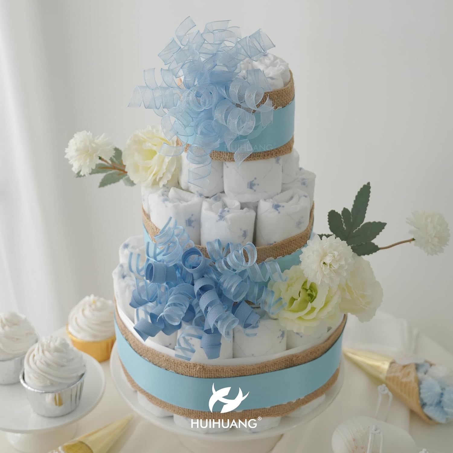 HUIHUANG Blue Bows for Gift Wrapping Burst Curly Gift Bows 5 inch x 8 Counts Self-Adhesive Curly Ribbon Bow for Presents, Treat Bags, Baby Shower Favors, Wrapping Accessories, Party Decor
