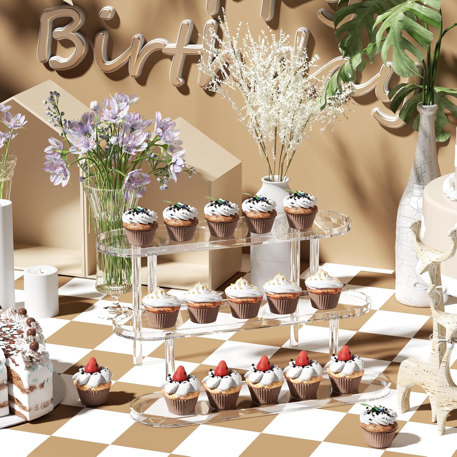 - UNIQUE OVAL GROOVE DESIGN: You can DIY any mini landscape you like in the acrylic tiered tray stand, bringing your collection to life. The raised edges add extra protection and help prevent items from falling