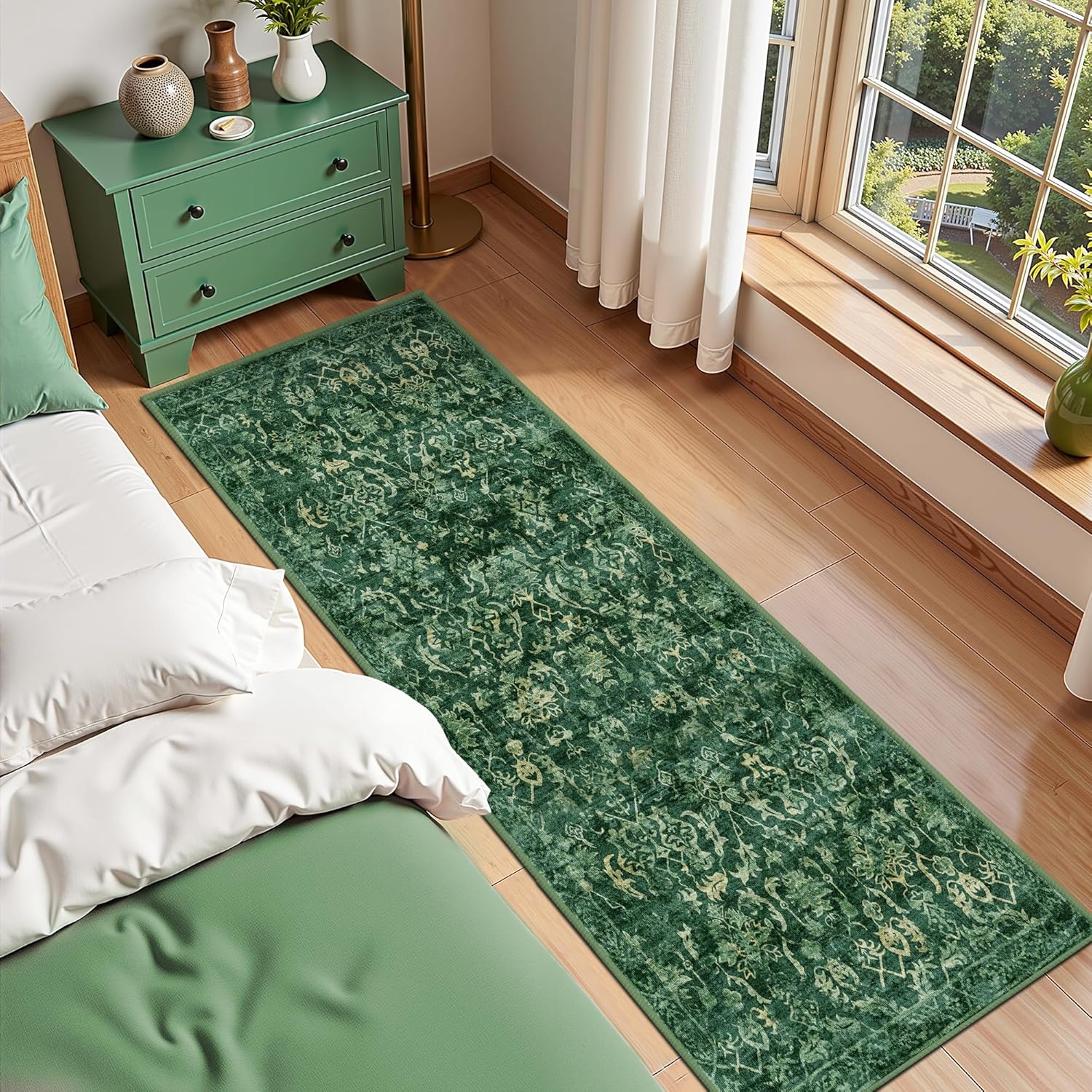 Dark Green 3x7 Runner Rug for Hallways Bed Side Kitchen, Boho Washable Distressed Low-Pile Floor Entryway Long Bathroom Mat, Non-Slip Laundry Room Washstand Front Carpet Green 36x84 Inch