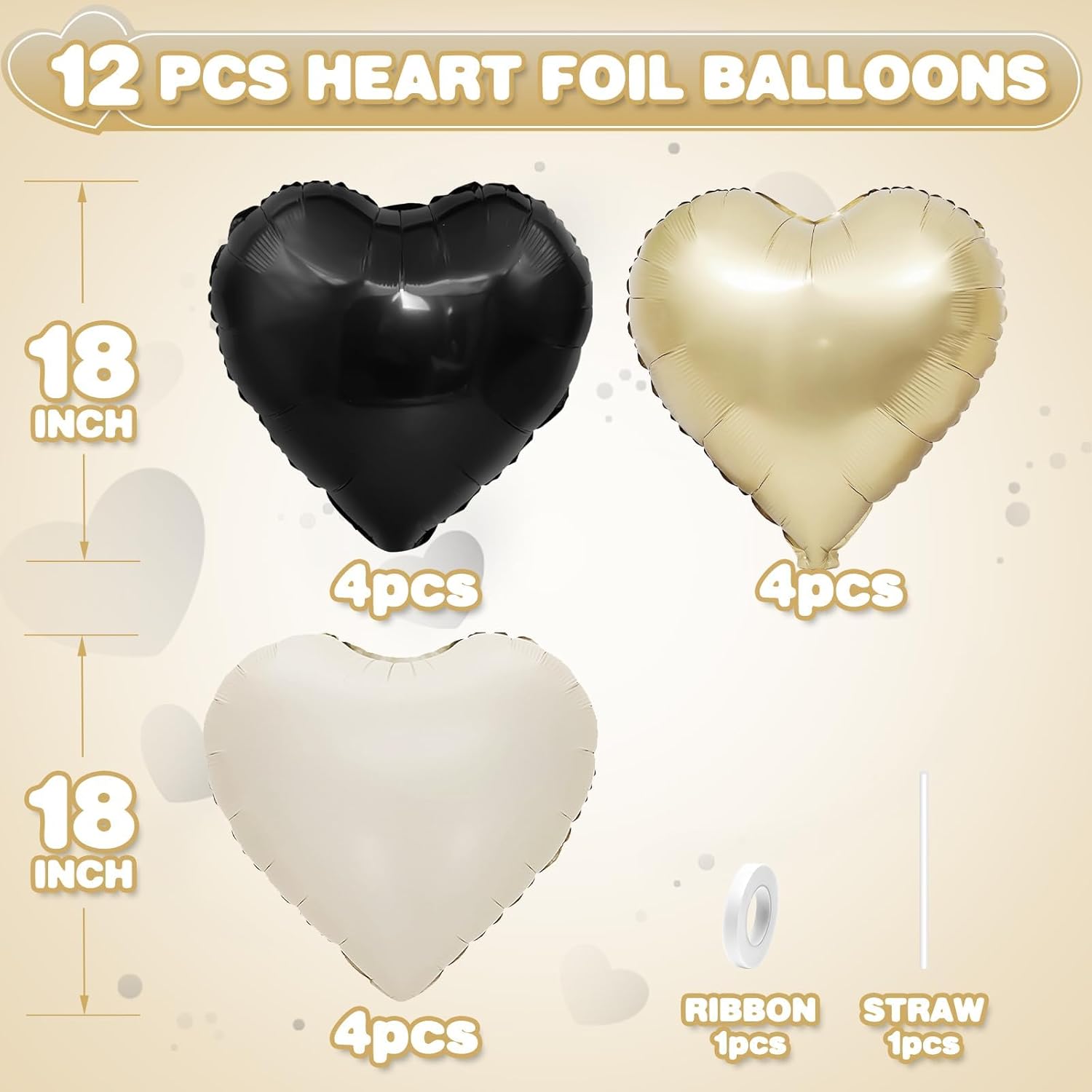 - 【12PCS HEART BALLOONS】Package include 4pcs cream white heart foil balloons,4pcs black heart foil balloons,4pcs light gold heart foil balloons,1pc straw.Large enough to help you better decorate your party.