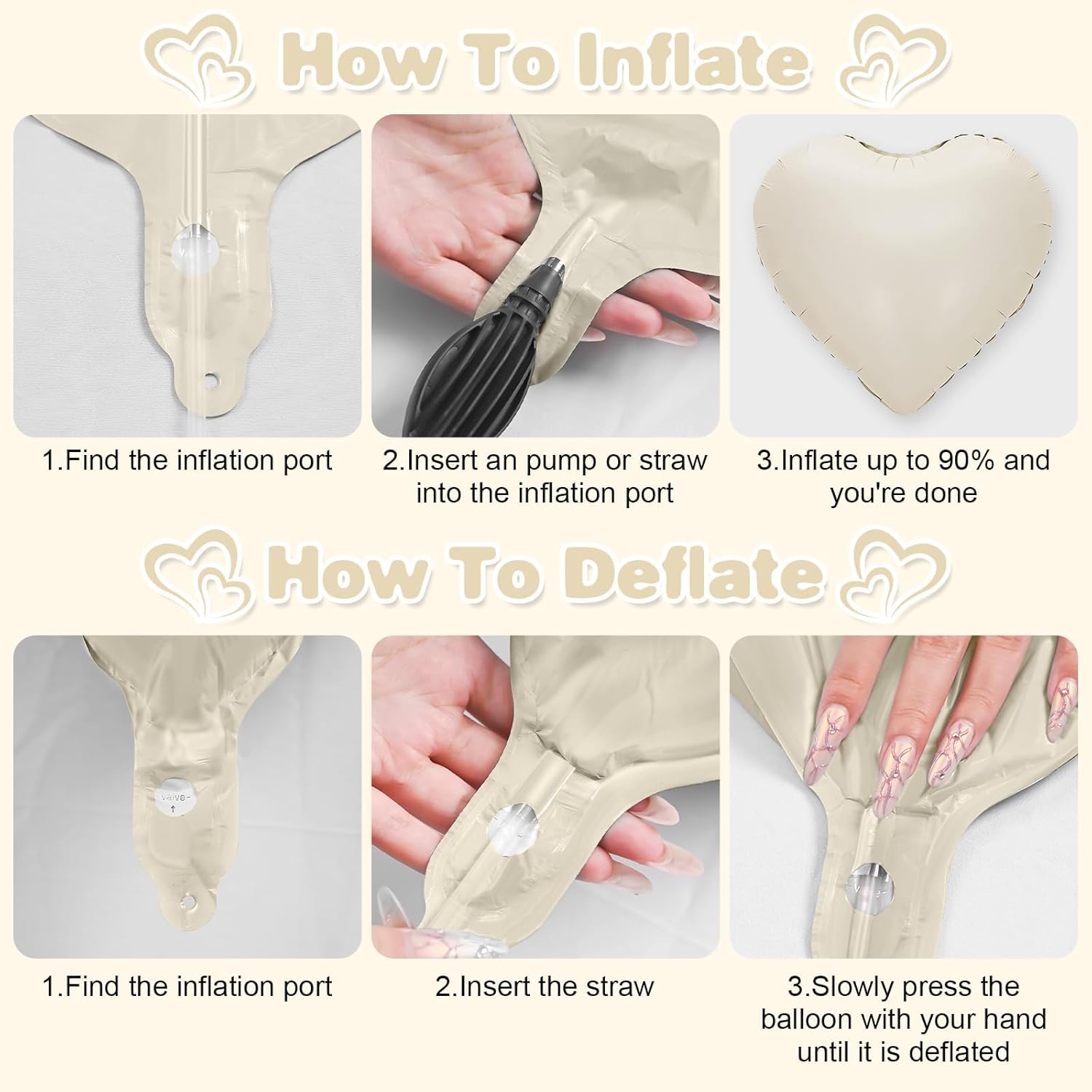 - EASY USE:Our heart shaped foil balloons are very easy to inflate,the straw inside the package helps you to inflate the balloon,the balloon can be filled with air and helium,after filling the balloon,you can pinch your finger to the position of the inflatable mouth to seal it automatically.