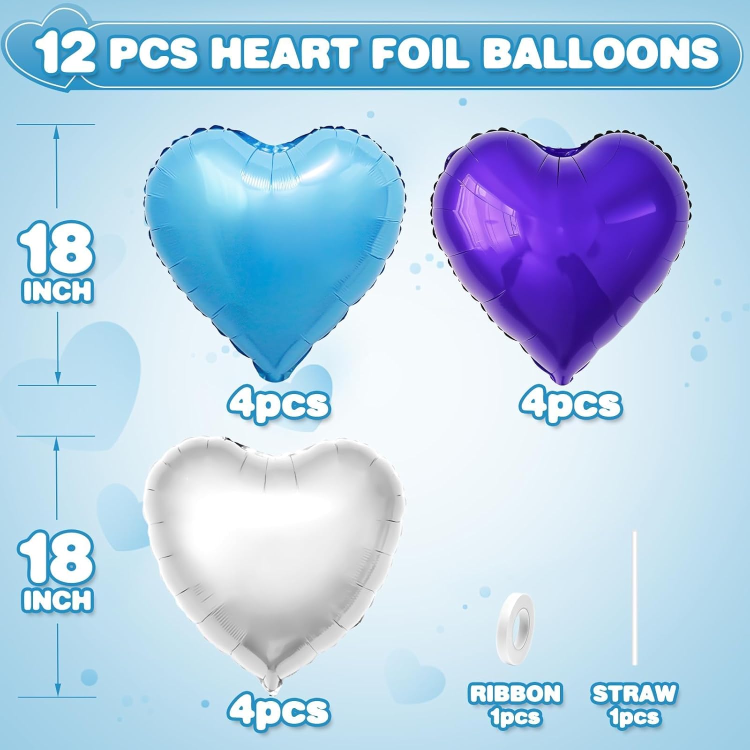 - 12PCS HEART BALLOONS:Package include 4pcs blue heart foil balloons,4pcs purple foil balloons,4pcs silver heart foil balloons,1pc straw.Large enough to help you better decorate your party.